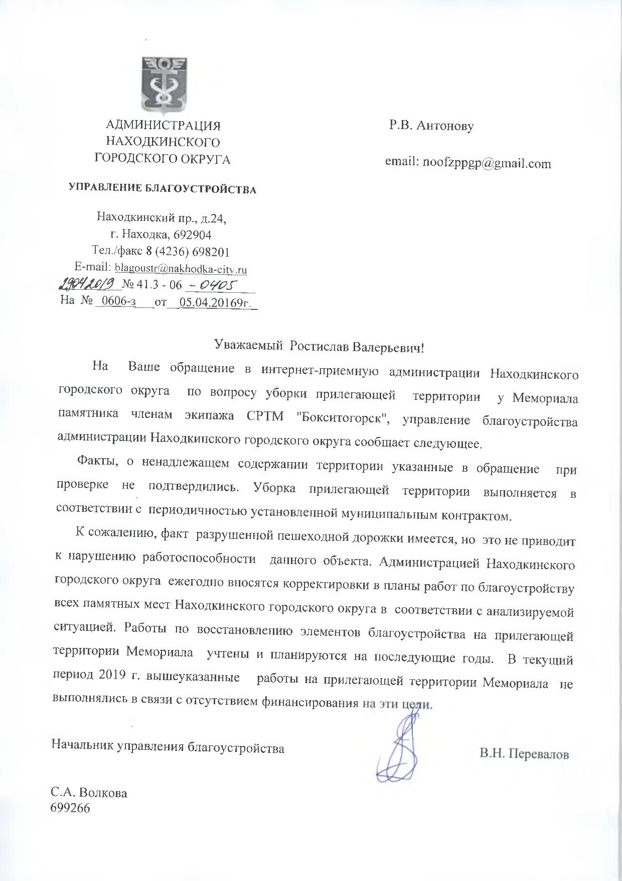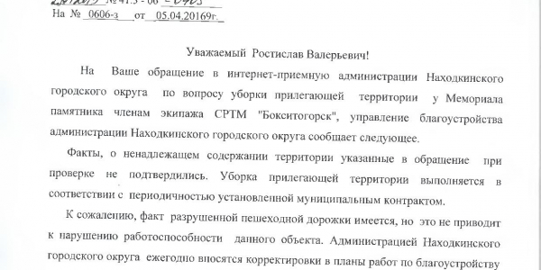 Номер жалобы:52883 Тип жалобы:Ненадлежащее содержание объектов культурного наследия Название объекта: Регион:Приморский край Город:Находка Адрес:Поклонная гора, мемориал "Скорбящая мать" Описание жалобы:Разрушена часть пилонов мемориала "Скорбящая мать" в городе Находке, установленный в 1979 году в память о рыбаках траулера «Бокситогорск», потерпевшего бедствие в Беринговом море. Является памятником регионального значения. Ненадлежаще содержится не только памятник, но и территория. Имеются повреждения тротуарной плитки у подножья бронзовой фигуры, на тротуарах, опасные надломы на ступеньках. Много мусора. Ране территория находилась под охраной, в настоящее время пункт охраны демонтирован.