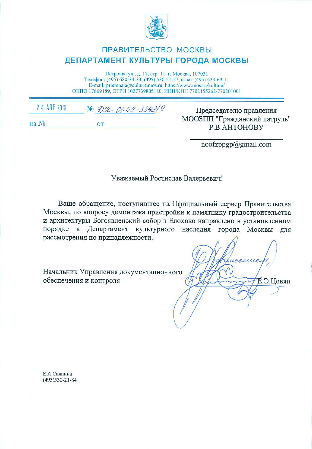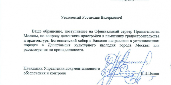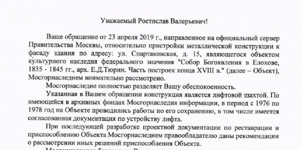 Номер жалобы:53697 Тип жалобы:Ненадлежащее содержание объектов культурного наследия Название объекта: Регион:Москва Город:Москва Адрес:Спартаковская улица, 15 Описание жалобы:https://tools.wmflabs.org/ru_monuments/wikivoyage.php?id=7710798000 Необходимо демонтировать пристройку, уродующую памятник градостроительства и архитектуры, вернуть Богоявленском собору исконный облик и привлечь к ответственности всех виновных лиц. Статус:
