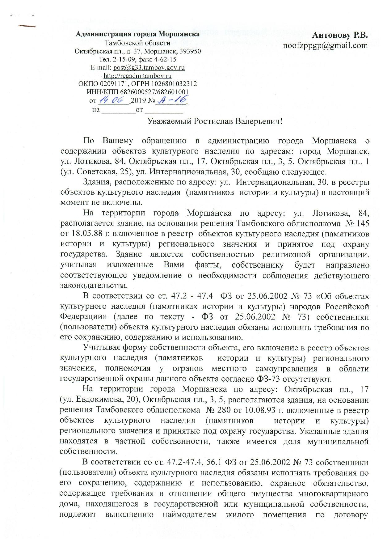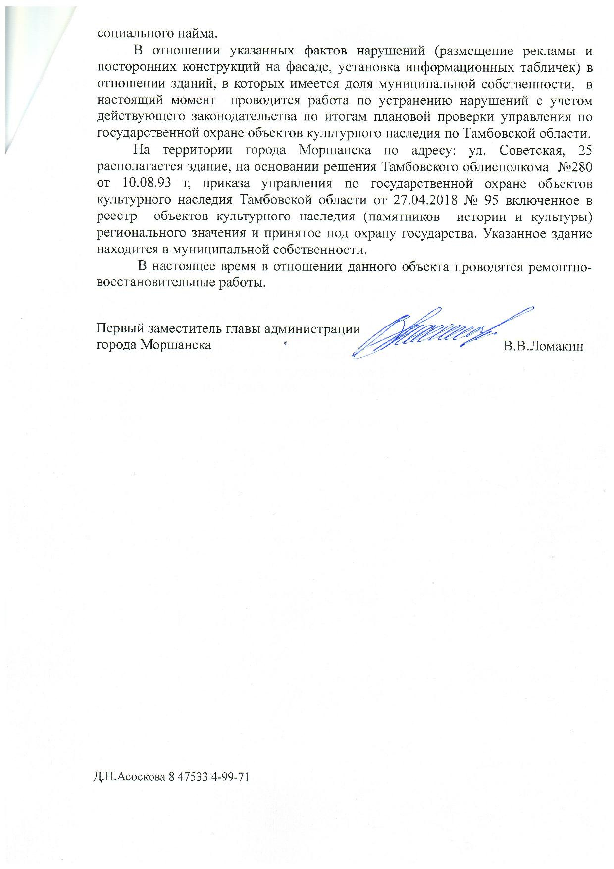 Номер жалобы:54776 Тип жалобы:Ненадлежащее содержание объектов культурного наследия Название объекта: Город:Моршанск Адрес:Моршанск, улица Лотикова, 90 Описание жалобы:реклама, нет таблички, здание ОКН. Статус: