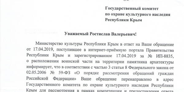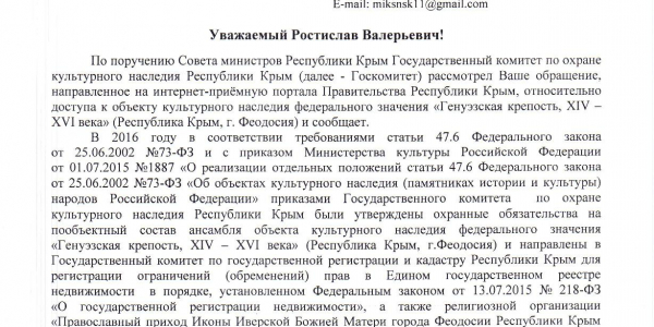 Номер жалобы:53514 Тип жалобы:Ненадлежащее содержание объектов культурного наследия Название объекта: Регион:Республика Крым Город:Феодосия Адрес:Старокарантинная улица, 3 Описание жалобы:Воинская часть расположена в развалинах генуэззкой крепости. По памятнику архитектуры проложена колючая проволока по стенам, вдоль стен стоят столбы ЛЭП. Доступ к памятнику архитектуры закрыт. Статус: