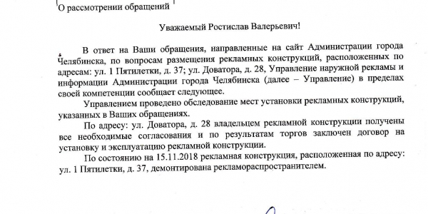 размещены незаконно, то есть без разрешения органа местного самоуправления на установку и эксплуатацию рекламной конструкции. Более того, конструкции портят архитектурный облик города Челябинска, что не соответствует Положению о порядке распространения наружной рекламы и информации в городе Челябинске, утвержденному решением Челябинской городской Думы от 10.12.2013 № 46/27. Статус: