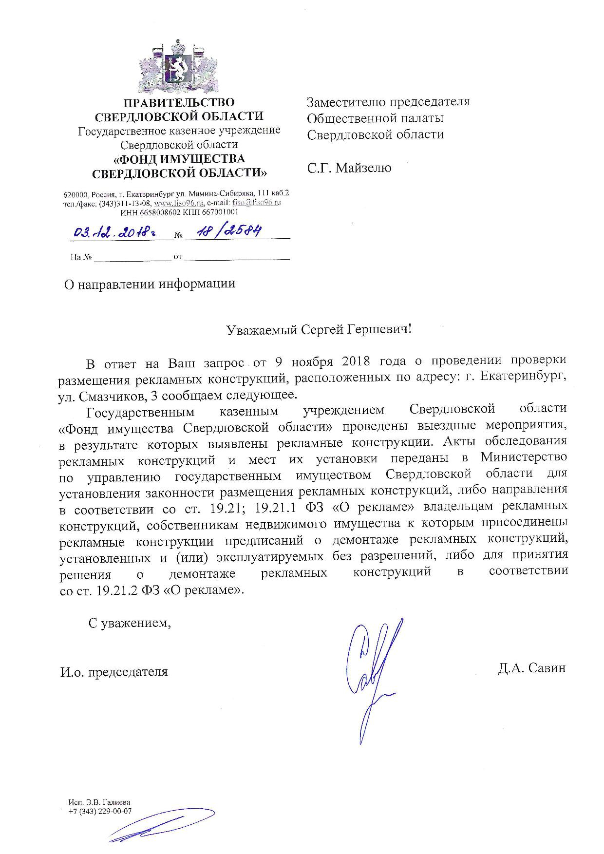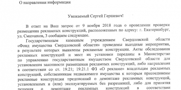 Номер жалобы:44438 Тип жалобы:Прочее Название объекта:МУГИСО Город:Екатеринбург Адрес:Екатеринбург, 3 улица Смазчиков Описание жалобы:Незаконные рекламные конструкции со стороны ул. Смазчиков Статус: