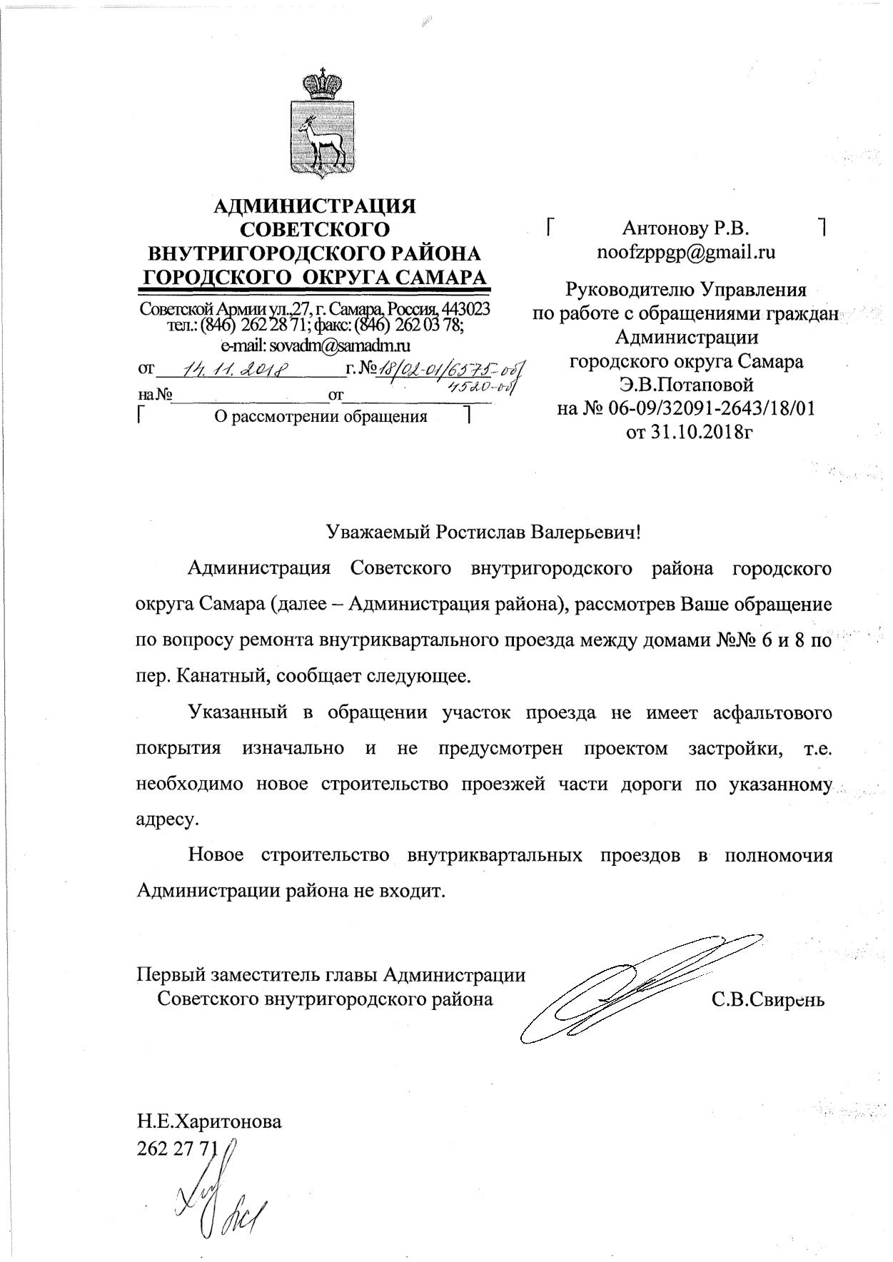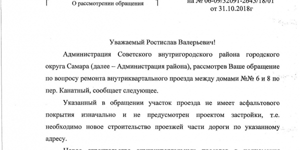 Номер жалобы:44078 Тип жалобы:Прочее Название объекта:? Регион:Самарская область Город:Самара Адрес:пер. Канатный, 3 Описание жалобы:Проезд между 5 И 3 во дворы Статус: