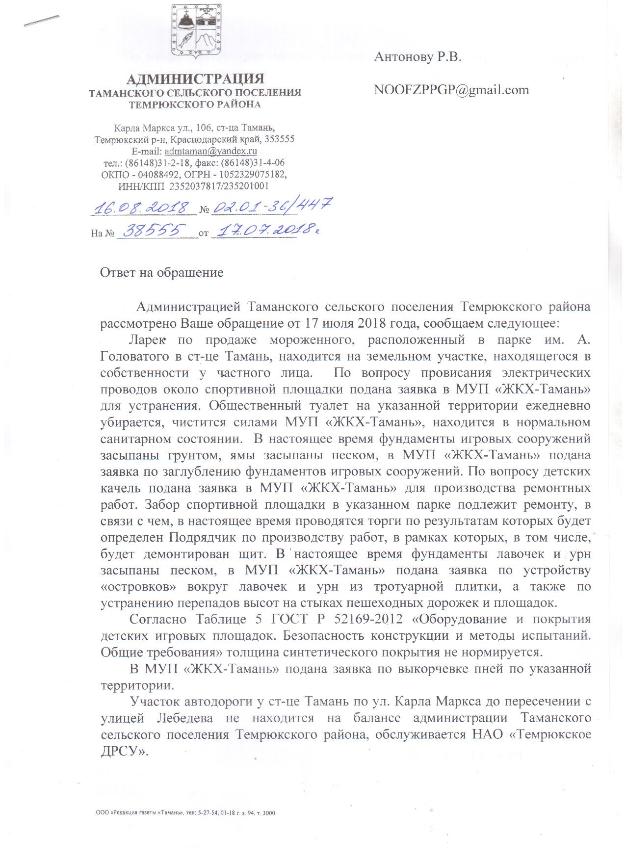 19. Администрацию станицы Тамань прошу пояснить почему в парке это уже 3 детский городок на такой маленькой территории а во всей станице больше таких городков нет. Данный парк расположен в 3 минутах от администрации города, в чем вижу использование служебного положения в личных целях, для своих семей, детей. Все деньги станицы на благоустройство завязаны на этом парке- больше ни в какие дворы и улицы они не идут.