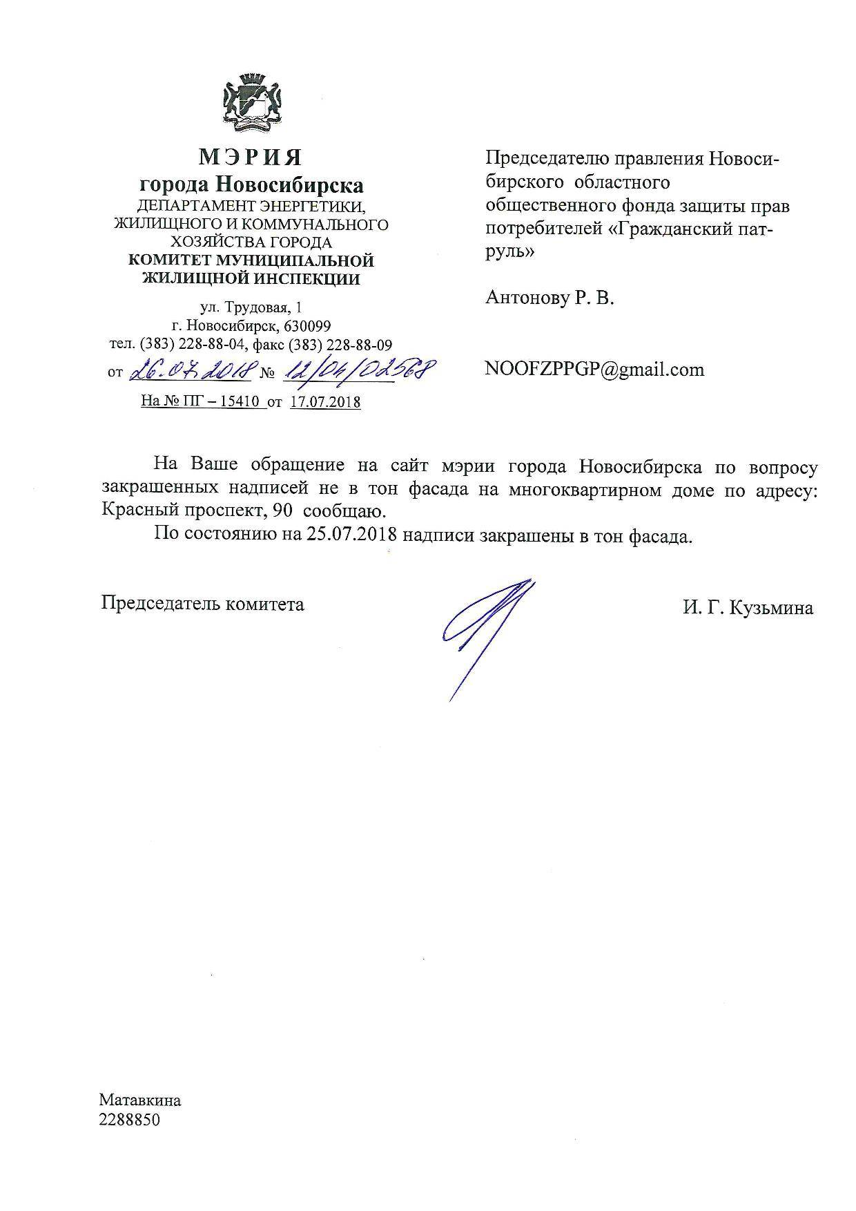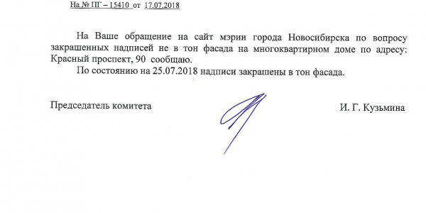 Номер жалобы:38653 Тип жалобы:Иные проблемы ЖКХ Название объекта:Управляющая Компания Регион:Новосибирская область Город:Новосибирск Адрес:Красный пр., 90 Описание жалобы:Надписи на фасаде дома закрашены не в тон Статус: