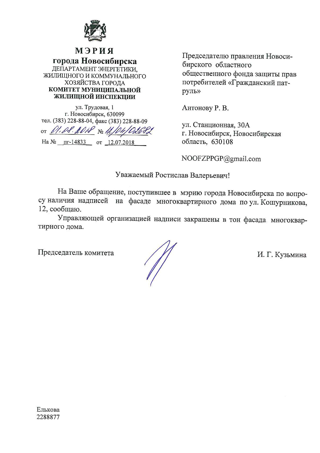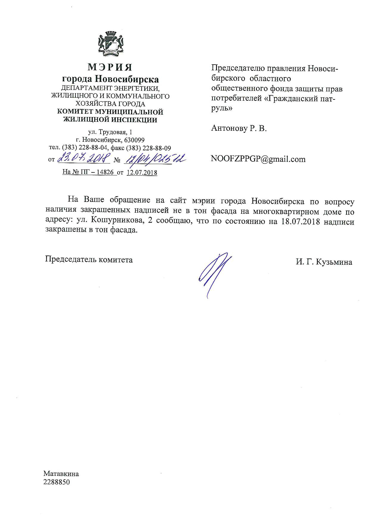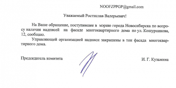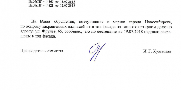 Номер жалобы:38524 Тип жалобы:Иные проблемы ЖКХ Название объекта:Управляющая Компания Регион:Новосибирская область Город:Новосибирск Адрес:ул. Фрунзе, 59/1 Описание жалобы:Надписи на фасаде дома Статус: