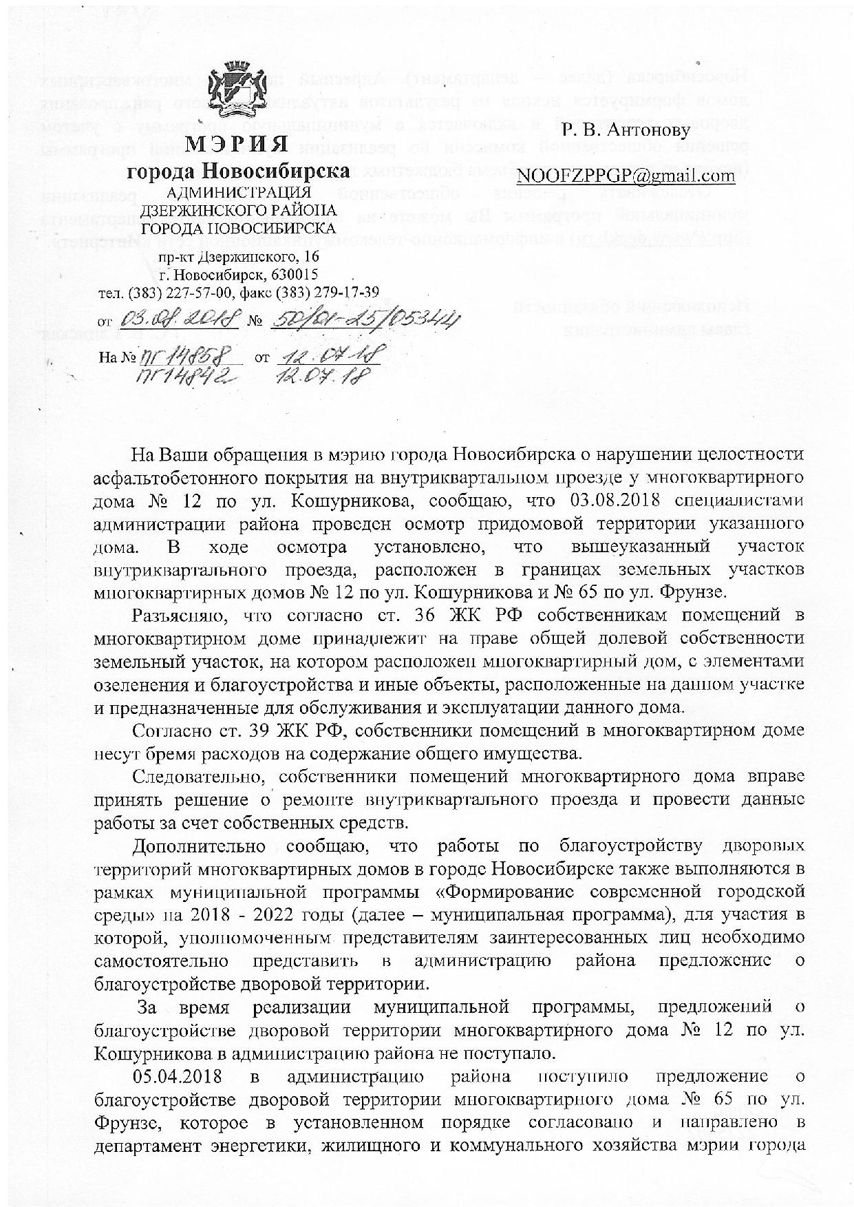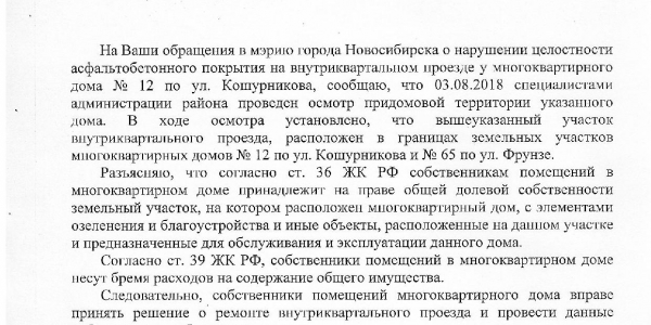 Номер жалобы:38536 Тип жалобы:Иные проблемы ЖКХ Название объекта:Управляющая Компания Регион:Новосибирская область Город:Новосибирск Адрес:ул. Кошурникова, 12 Описание жалобы:Ямы на межквартальной дороге Статус: