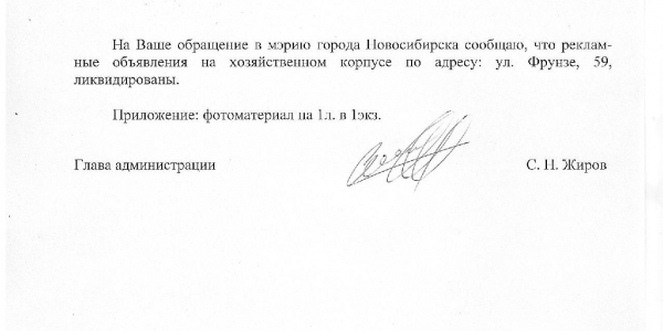 Номер жалобы:38525 Тип жалобы:Иные проблемы ЖКХ Название объекта:Управляющая Компания Регион:Новосибирская область Город:Новосибирск Адрес:ул. Фрунзе, 59 Описание жалобы:Объявления на хозяйственном корпусе Статус: