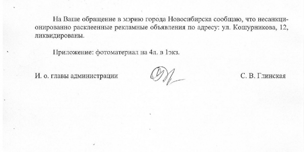 Номер жалобы:38533 Тип жалобы:Иные проблемы ЖКХ Название объекта:Управляющая Компания Регион:Новосибирская область Город:Новосибирск Адрес:ул. Кошурникова, 12 Описание жалобы:Объявления в неположенном месте Статус: