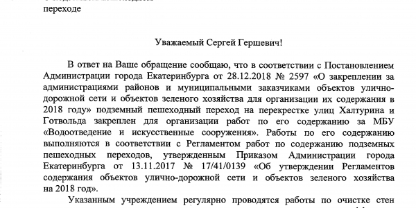 Номер жалобы:43895 Тип жалобы:Прочее Название объекта: Регион:Свердловская область Город:Екатеринбург Адрес:улица Бебеля, 17 Описание жалобы: Необходимо обустройство подземного перехода на ул. Бебеля, 17, который находится в аварийном состоянии.