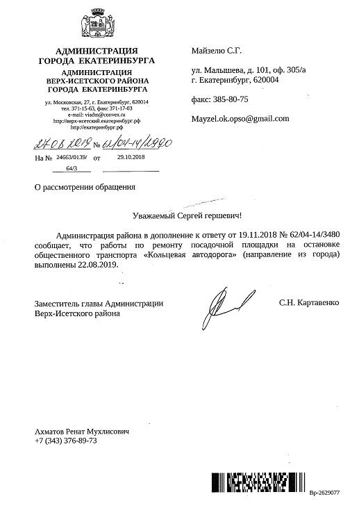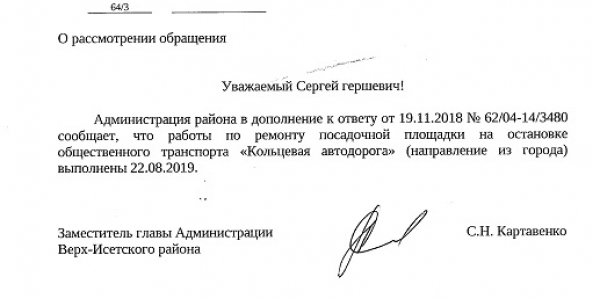 Номер жалобы:43783 Тип жалобы:Прочее Название объекта:Мэрия Регион:Свердловская область Город:Екатеринбург Адрес:Объездная дорога Описание жалобы:Необходимо восстановление покрытия посадочной площадки остановки «Кольцевая дорога» (в направлении Чусовского тракта) на месте демонтированной опоры. Статус: