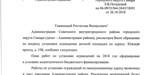 Номер жалобы:43721 Тип жалобы:Прочее Название объекта:? Регион:Самарская область Город:Самара Адрес:пр. Южный, 224 Описание жалобы:Нет лежачих полицейских и знаков ограничения скорости вдоль детской площадки. Машины летают на больших скоростях Статус:
