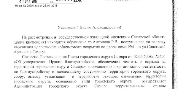 Номер жалобы:43723 Тип жалобы:Прочее Название объекта:? Регион:Самарская область Город:Самара Адрес:ул. Советской Армии, 4 Описание жалобы:Неровности ямы во дворе Статус: