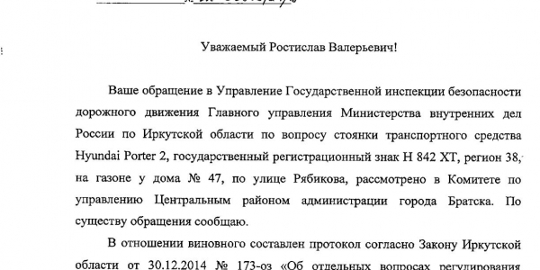 Номер жалобы:43872 Тип жалобы:Прочее Название объекта:Администрация Регион:Иркутская Город:Братск Адрес:ул. Рябикова, 47 Описание жалобы:Парковка на газоне, разрушение благоустройство города. 25.10.18 16:10 Статус: