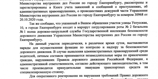 Номер жалобы:69177 Тип жалобы:Прочее Название объекта:мэрия Регион:Свердловская область Город:Екатеринбург Адрес:Уктусская улица, 10 Описание жалобы:На пересечении тротуара вдоль улицы Уктусской и въезда во двор между домами № 10 по улице Уктусской и № 66 по улице Фурманова осуществляется парковка автобмобилей. Необходимо произвести установку ограждений, либо сужение дороги. Статус: