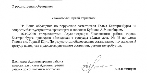 Номер жалобы:69178 Тип жалобы:Прочее Название объекта:мэрия Регион:Свердловская область Город:село Горный Щит Адрес:улица Титова, 49 Описание жалобы:Необходим ремонт тротуара. Статус: