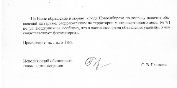 Номер жалобы:38415 Тип жалобы:Иные проблемы ЖКХ Название объекта:Управляющая Компания Регион:Новосибирская область Город:Новосибирск Адрес:ул. Кошурникова, 7/1 Описание жалобы:Надписи и объявления на гаражах Статус: