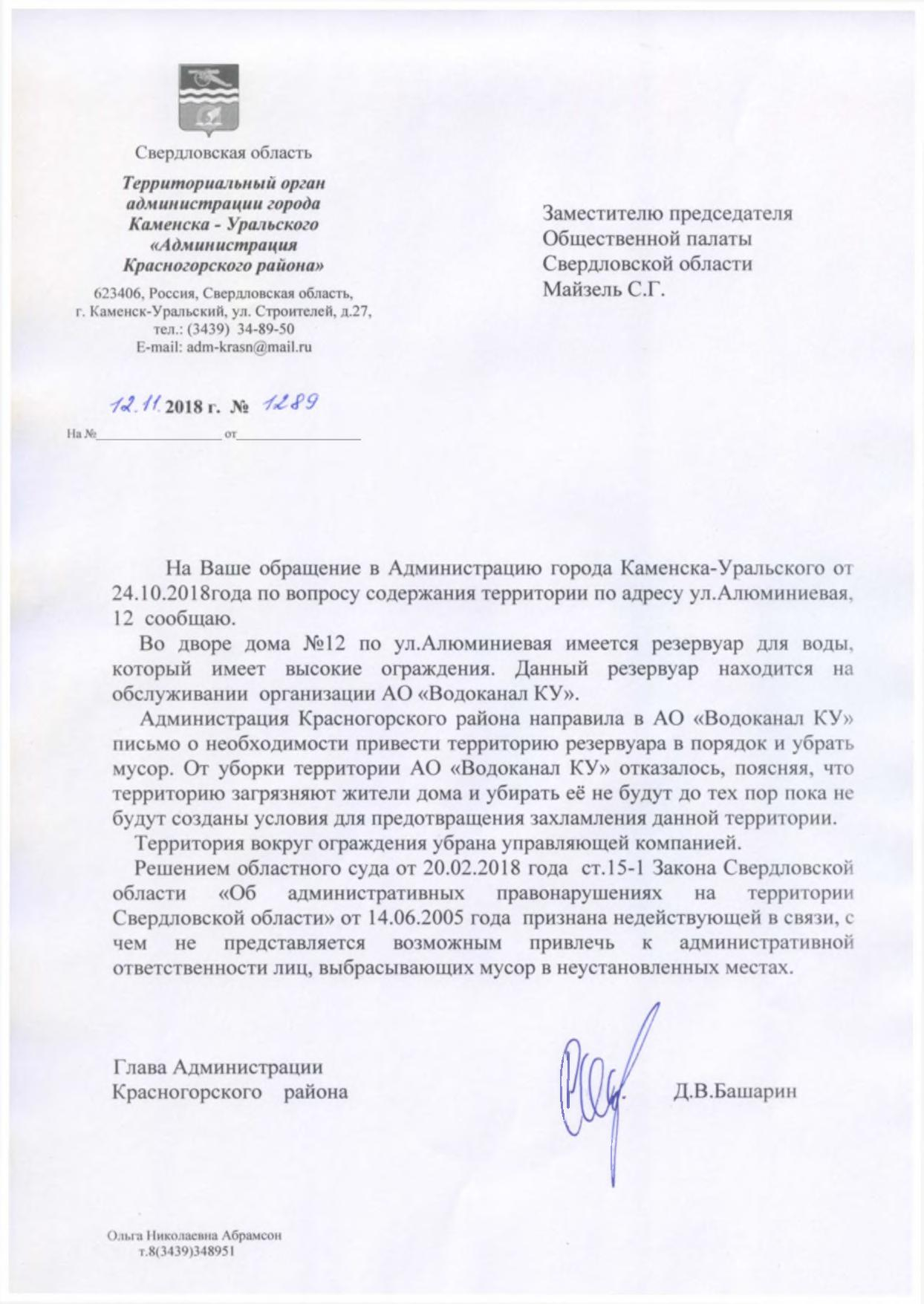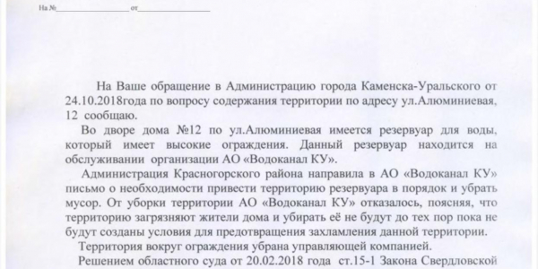 Номер жалобы:43300 Тип жалобы:Прочее Название объекта:Администрация Города Каменск-уральский Регион:Свердловская область Город:Каменск-Уральский Адрес:Алюминиевая ул., 12 Описание жалобы:Убрать мусор напротив дома по адресу: ул. Алюминиевая 12 Статус:
