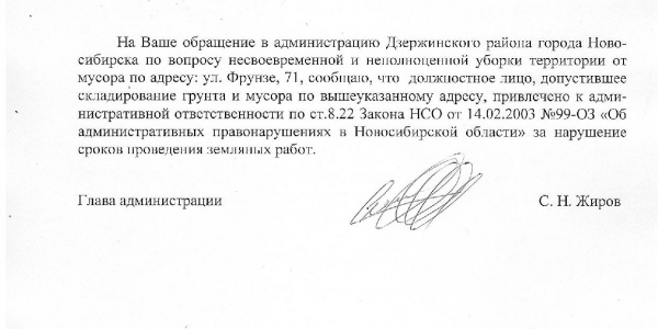 Номер жалобы:38270 Тип жалобы:Иные проблемы ЖКХ Название объекта:Управляющая Компания Регион:Новосибирская область Город:Новосибирск Адрес:ул. Фрунзе, 71 Описание жалобы:Рядом с домом много мусора около хоз корпуса Статус:
