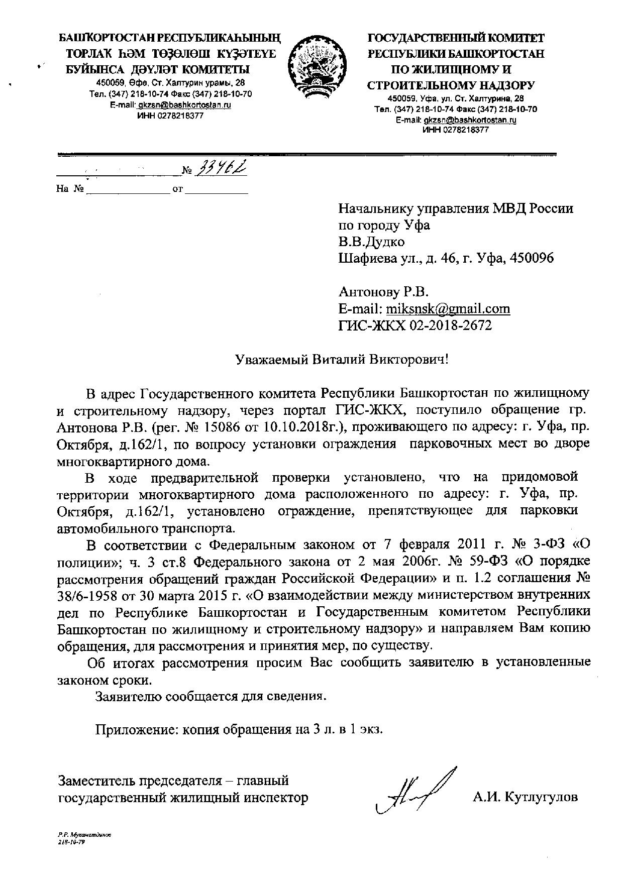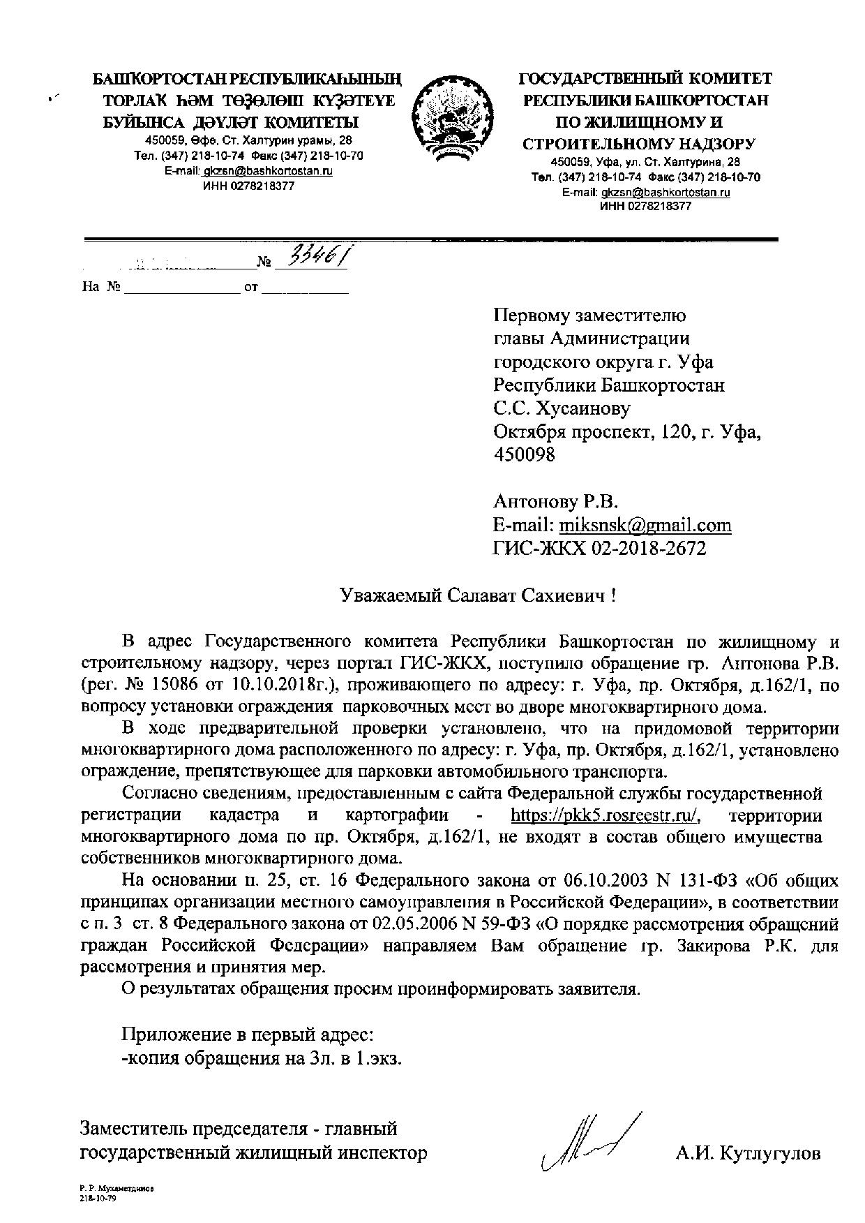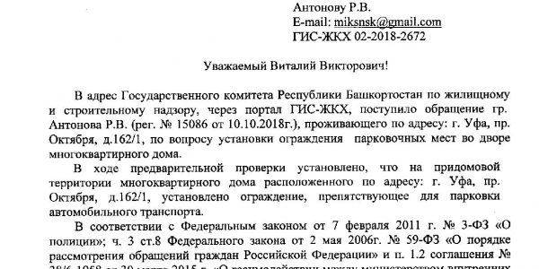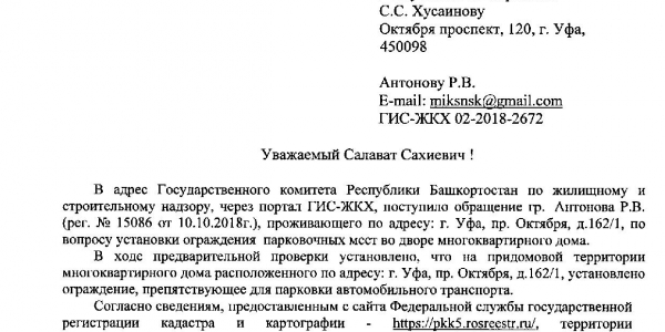 Номер жалобы:42621 Тип жалобы:Прочее Название объекта:ГИБДД Город:Уфа Адрес:Уфа, 162/1 проспект Октября Описание жалобы:Напротив 1-го подъезда дома по адресу проспект Октября 162/1 появилась огороженный территория для стоянки авто. Необходимо проверить законна ли она или это самозахват. Статус: