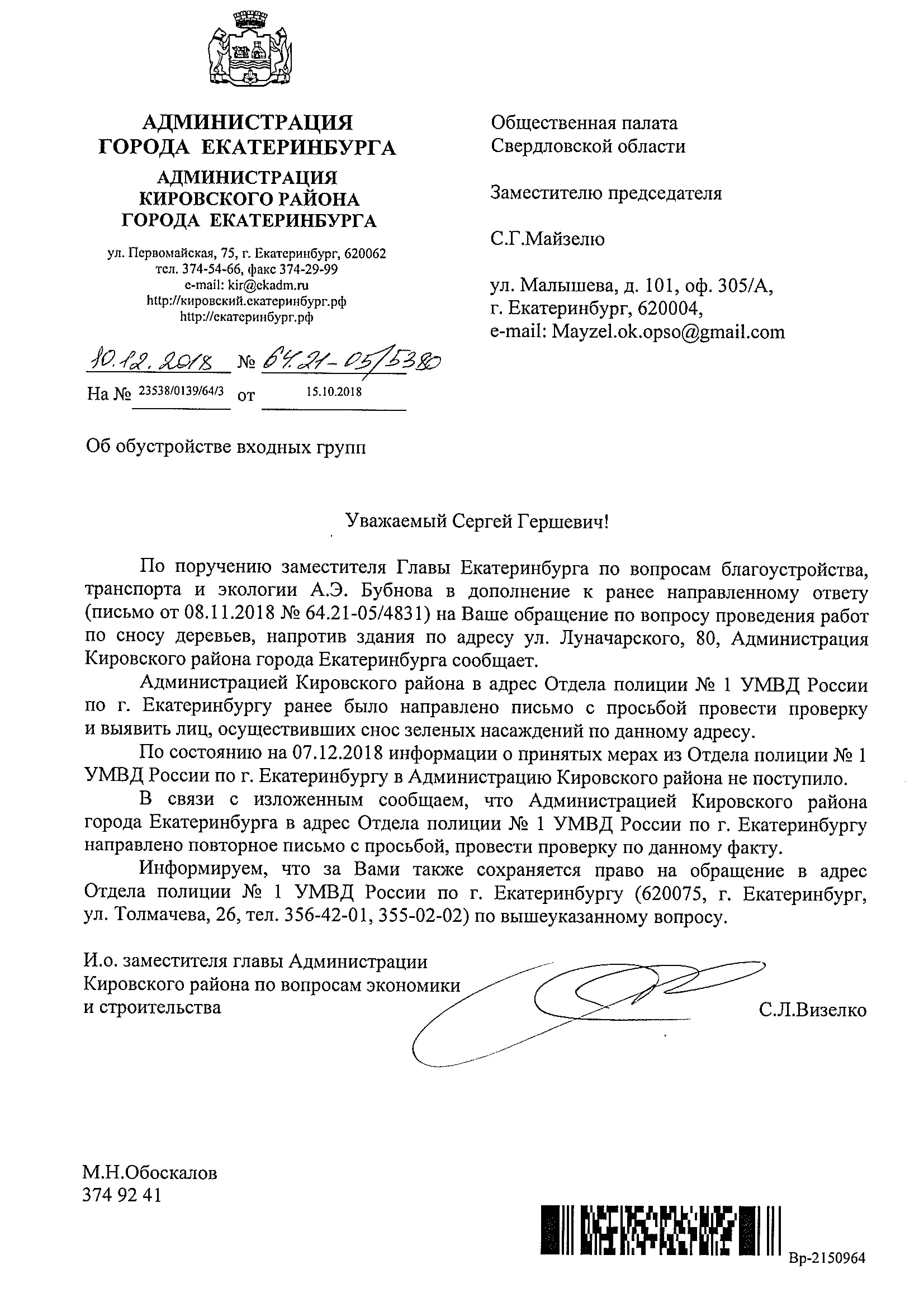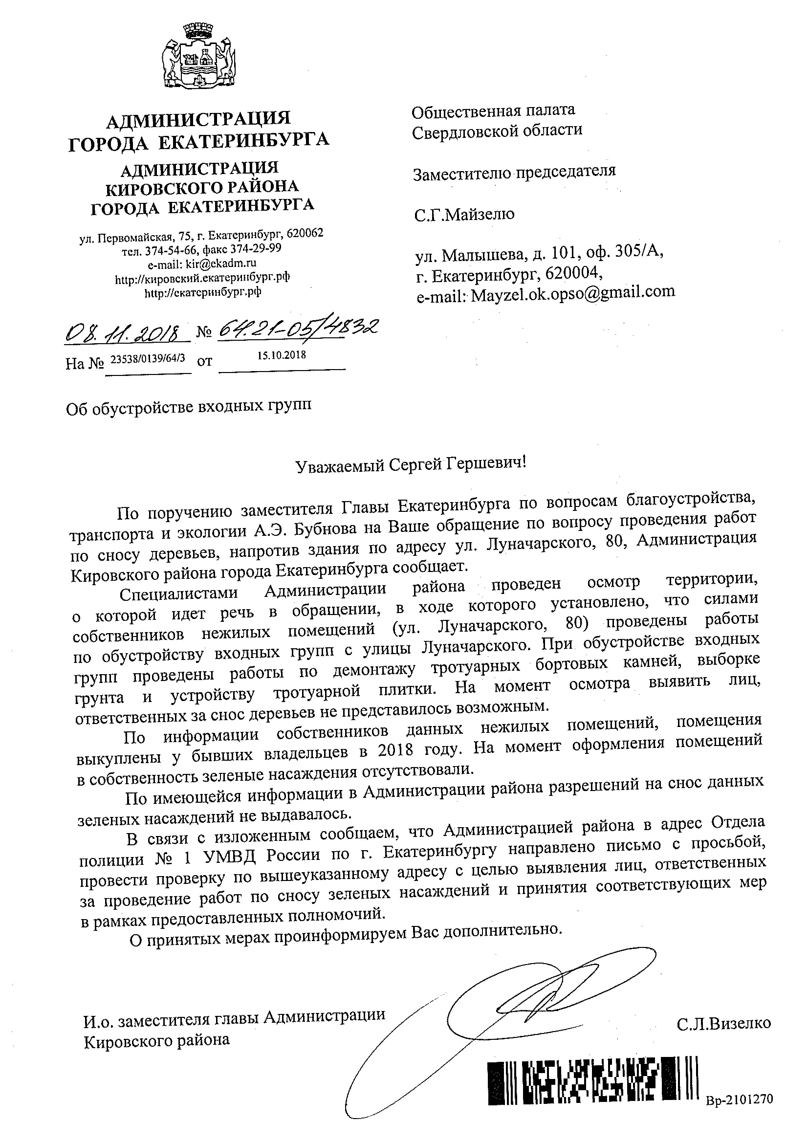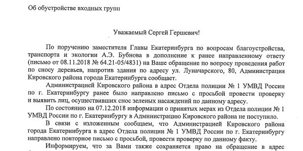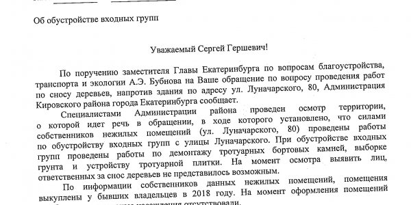 Номер жалобы:42645 Тип жалобы:Прочее Название объекта:Физ Лицо Город:Екатеринбург Адрес:Екатеринбург, 80 улица Луначарского Описание жалобы:выкорчевали деревья, которые мешали обзору новых входных групп Статус:
