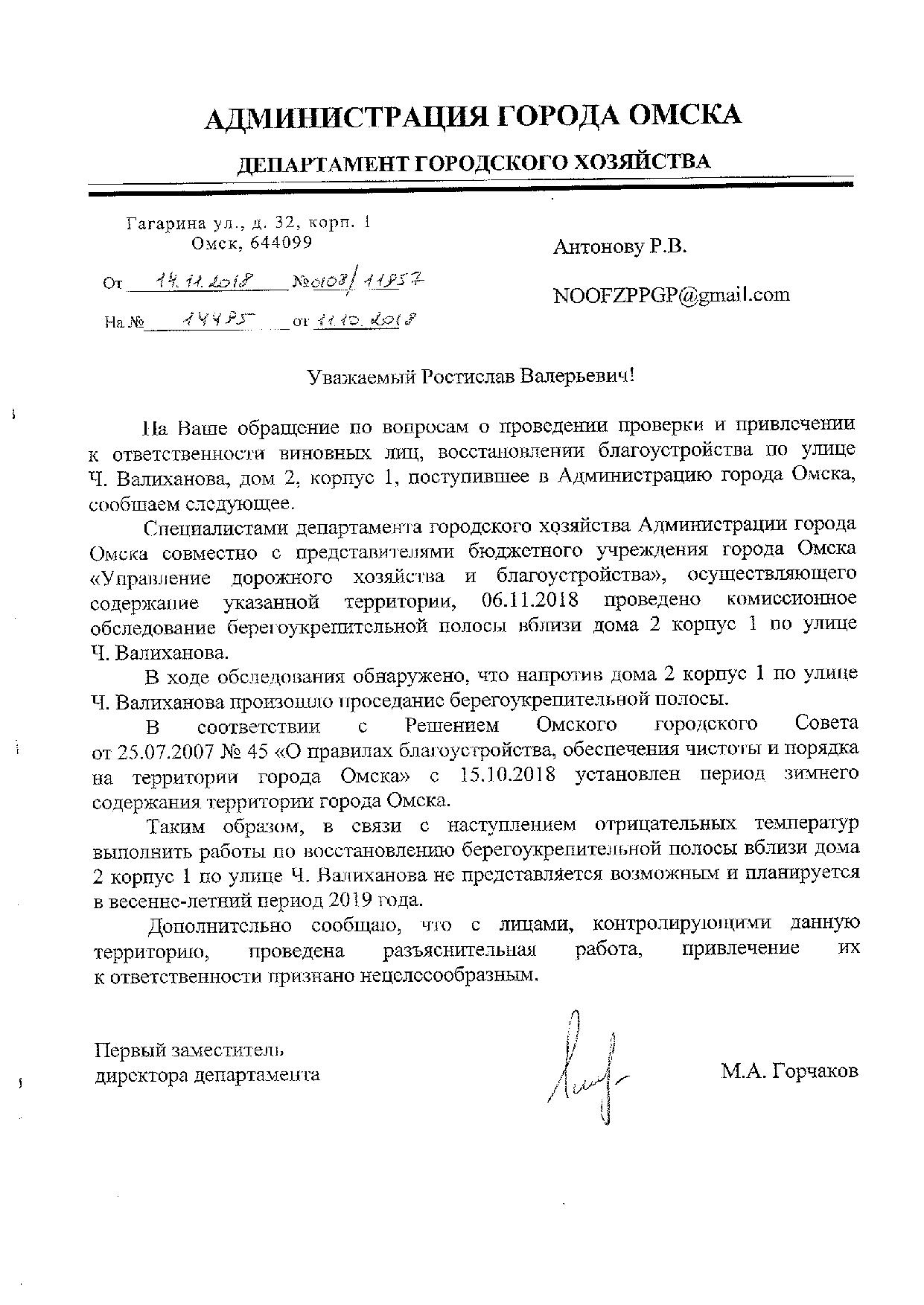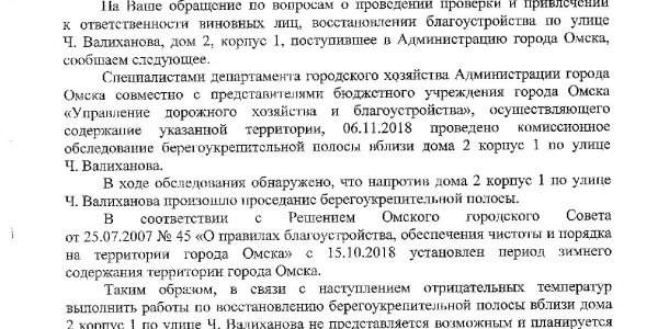 Номер жалобы:42652 Тип жалобы:Прочее Название объекта:? Регион:Омская область Город:Омск Адрес:ул. Чокана Валиханова, 2 корпус 1 Описание жалобы:Обрушение набережной Статус: