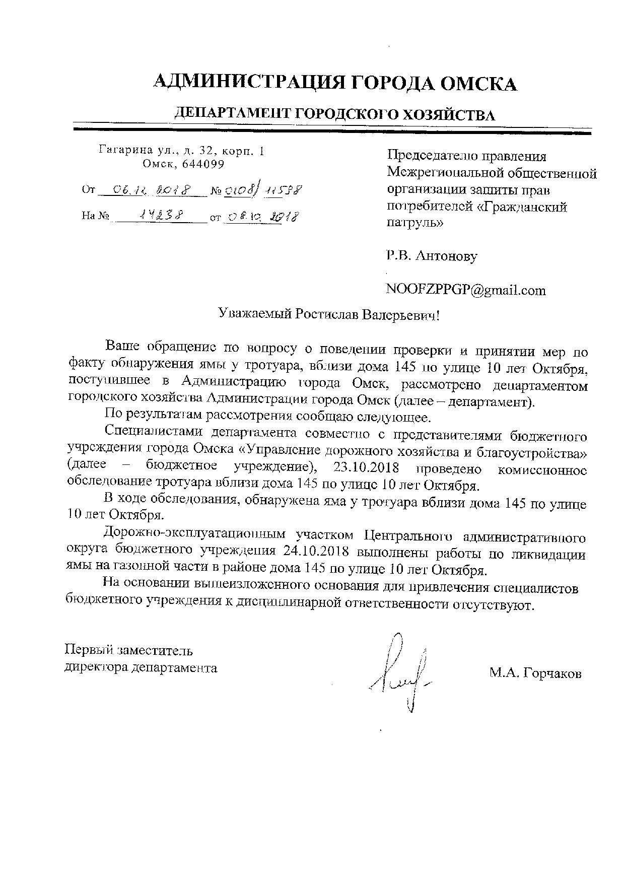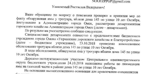 Номер жалобы:42456 Тип жалобы:Прочее Название объекта:? Регион:Омская область Город:Омск Адрес:ул. 10 лет Октября, 145 Описание жалобы:Опасная яма у тротуара Статус: