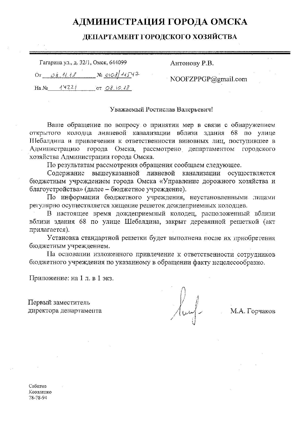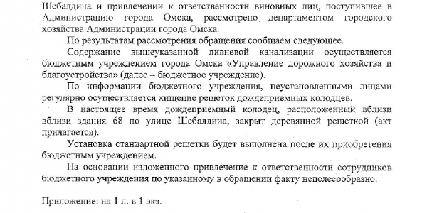 Номер жалобы:42463 Тип жалобы:Прочее Название объекта:? Регион:Омская область Город:Омск Адрес:ул. Шебалдина, 68 Описание жалобы:Открытая ливневка на дороге по улице 10 лет Октября напротив дома 125