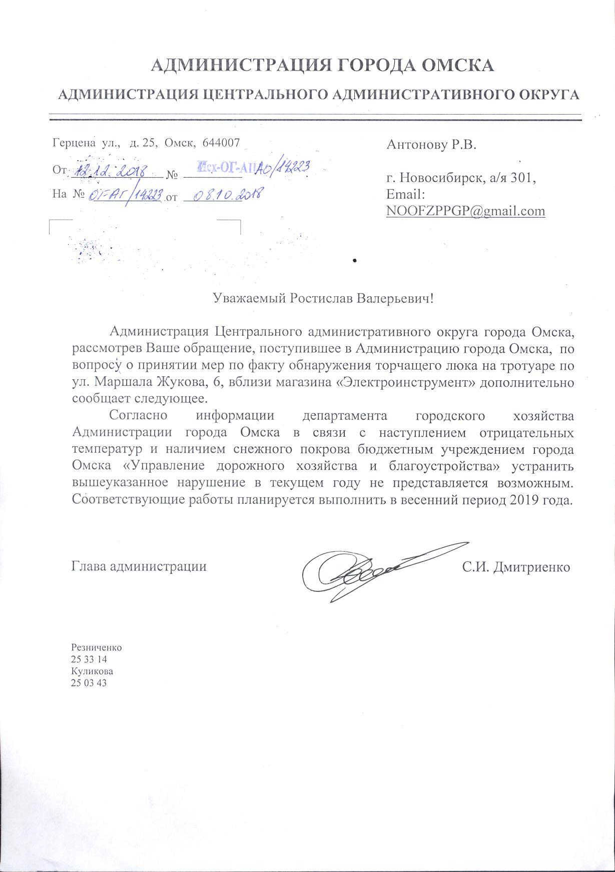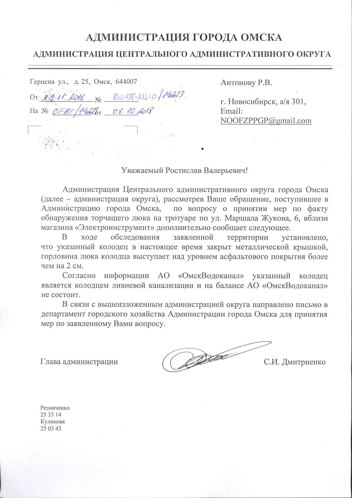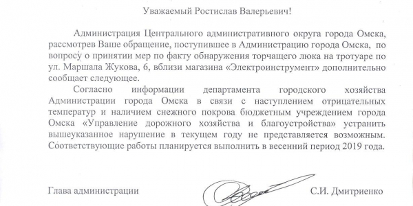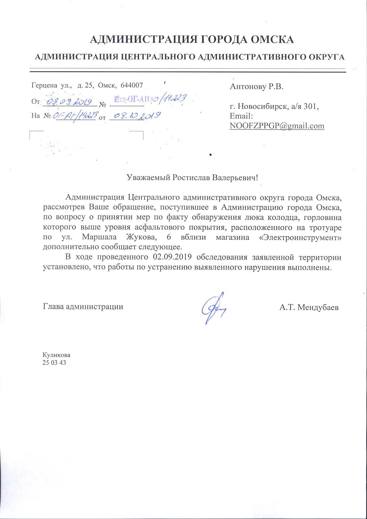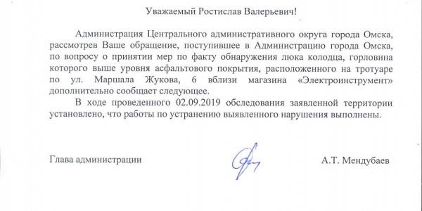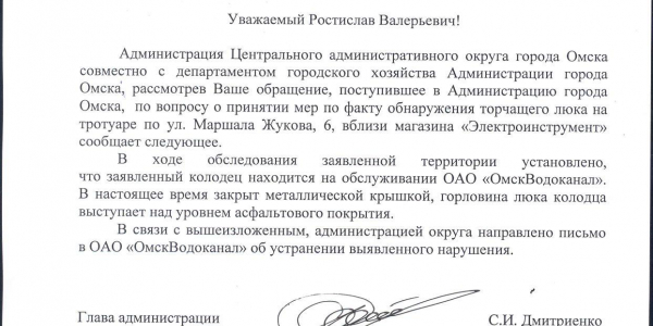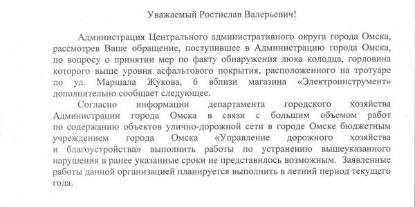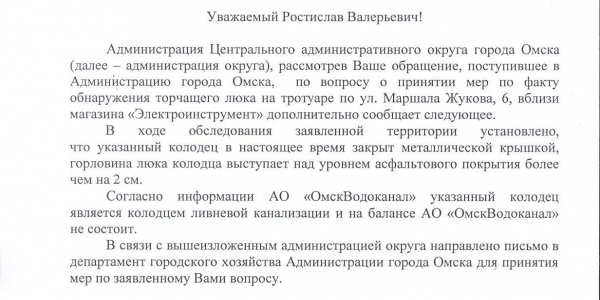 Номер жалобы:42496 Тип жалобы:Прочее Название объекта:? Регион:Омская область Город:Омск Адрес:ул. Маршала Жукова, 6 Описание жалобы:Люк торчит на тротуаре. Напротив магазина Электроинструмент Статус: