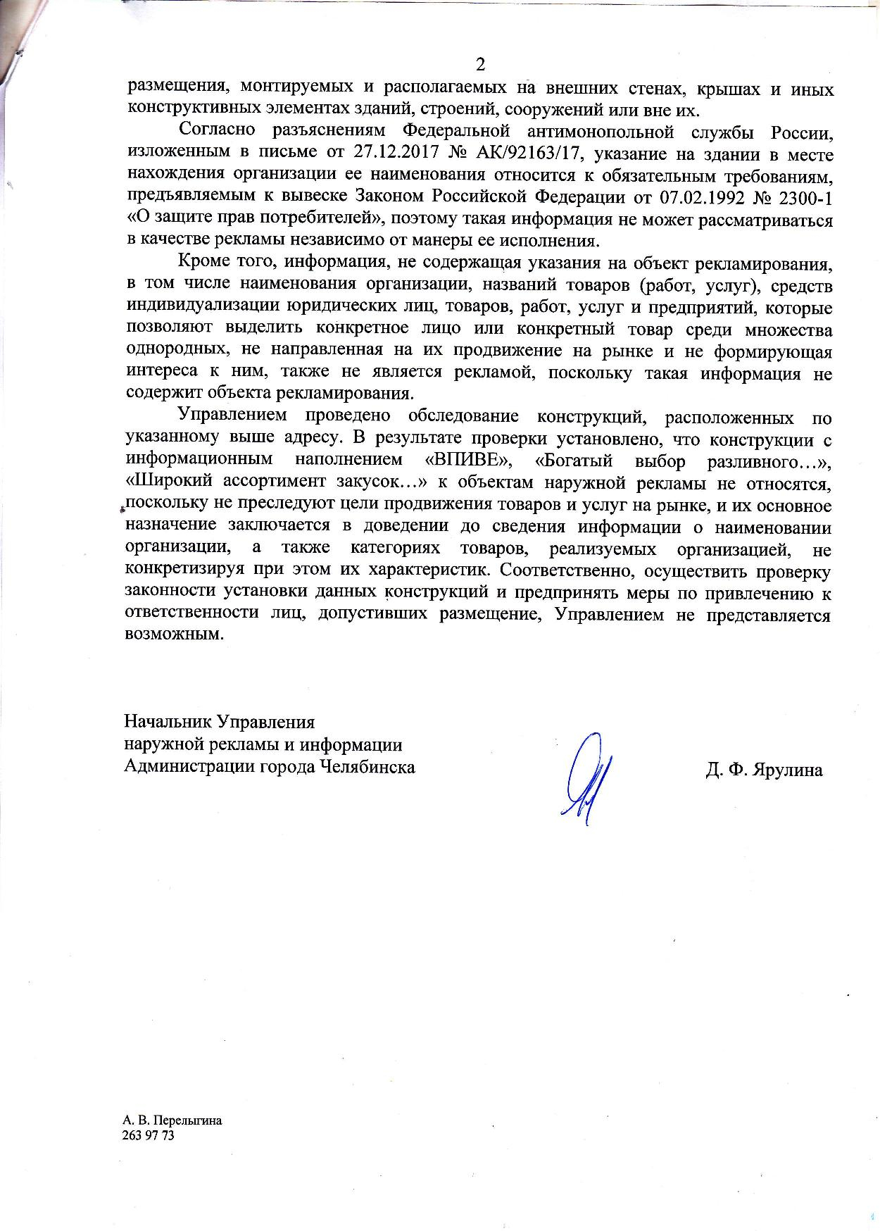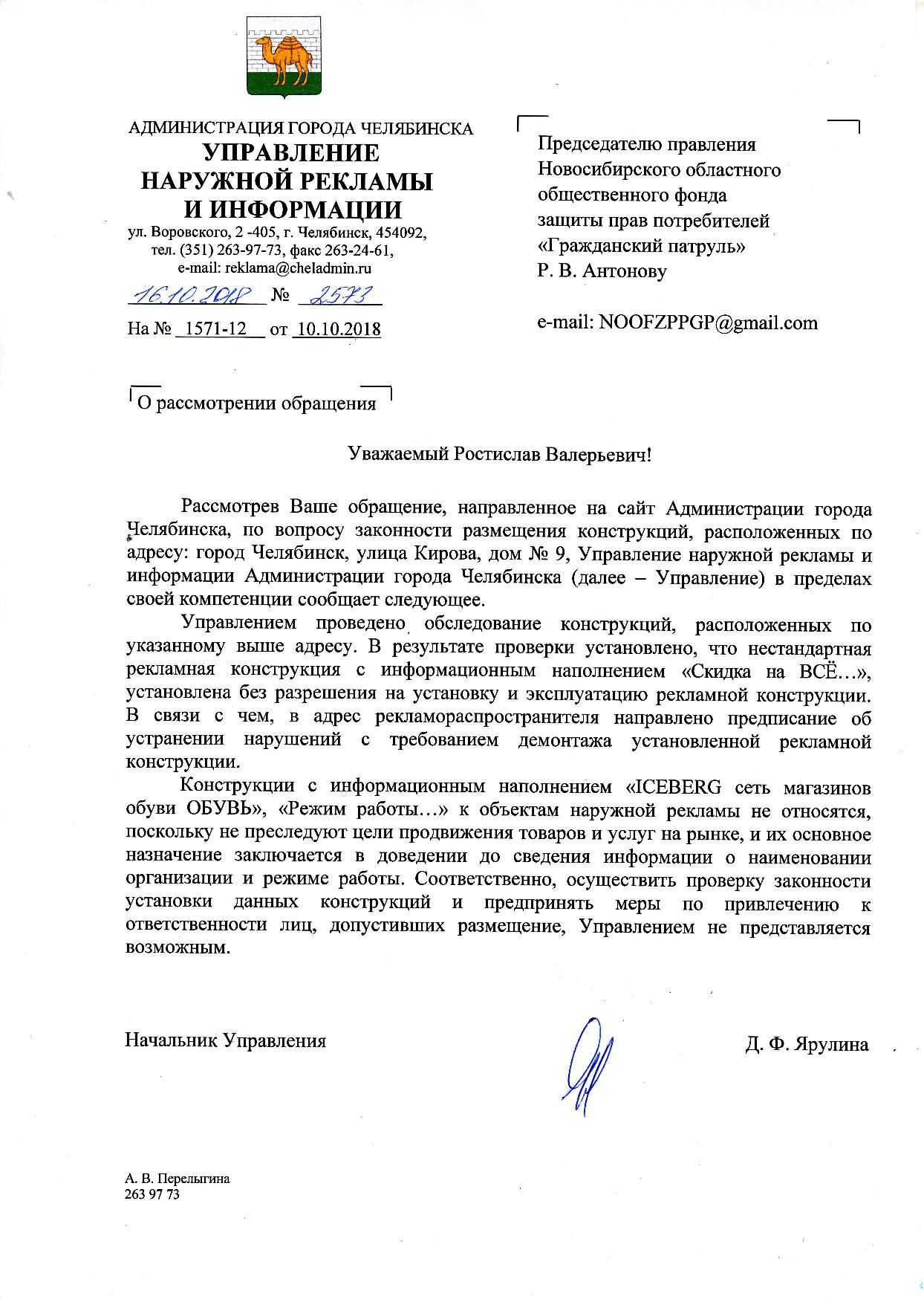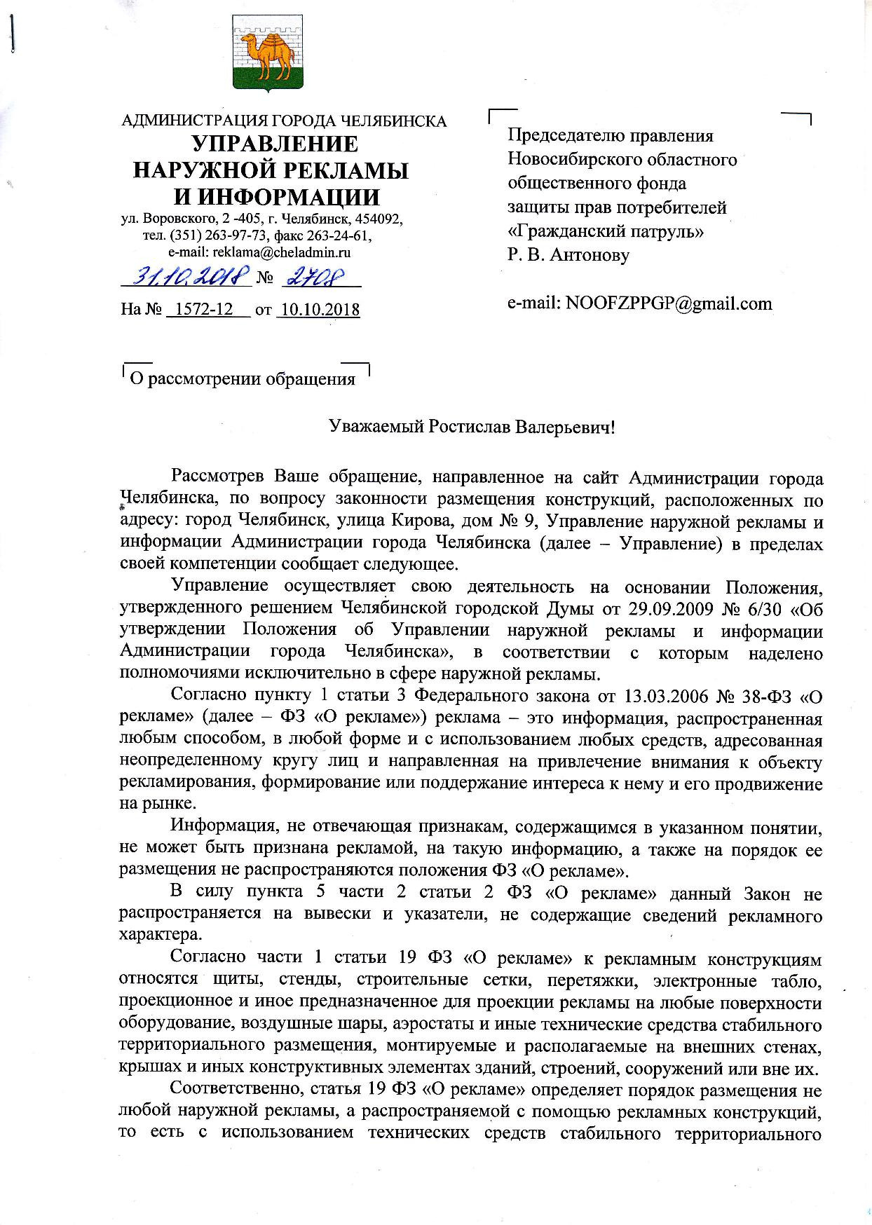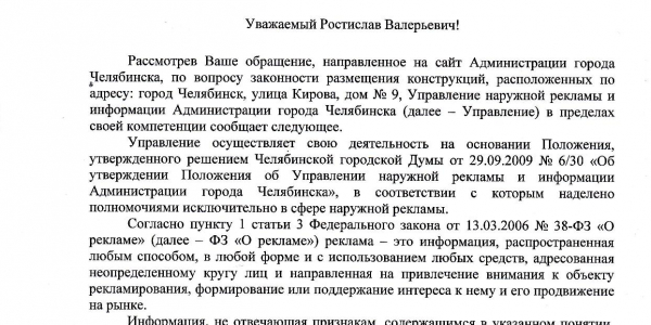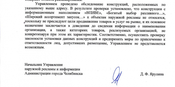 Номер жалобы:42500 Тип жалобы:Прочее Название объекта:Администрация Калининского Района Город:Челябинск Адрес:Челябинск, 9 улица Кирова Описание жалобы:Реклама на фасаде Статус: