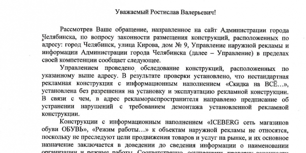 Номер жалобы:42499 Тип жалобы:Прочее Название объекта:Администрация Калининского Района Город:Челябинск Адрес:Челябинск, 9 улица Кирова Описание жалобы:Реклама на фасаде Статус: