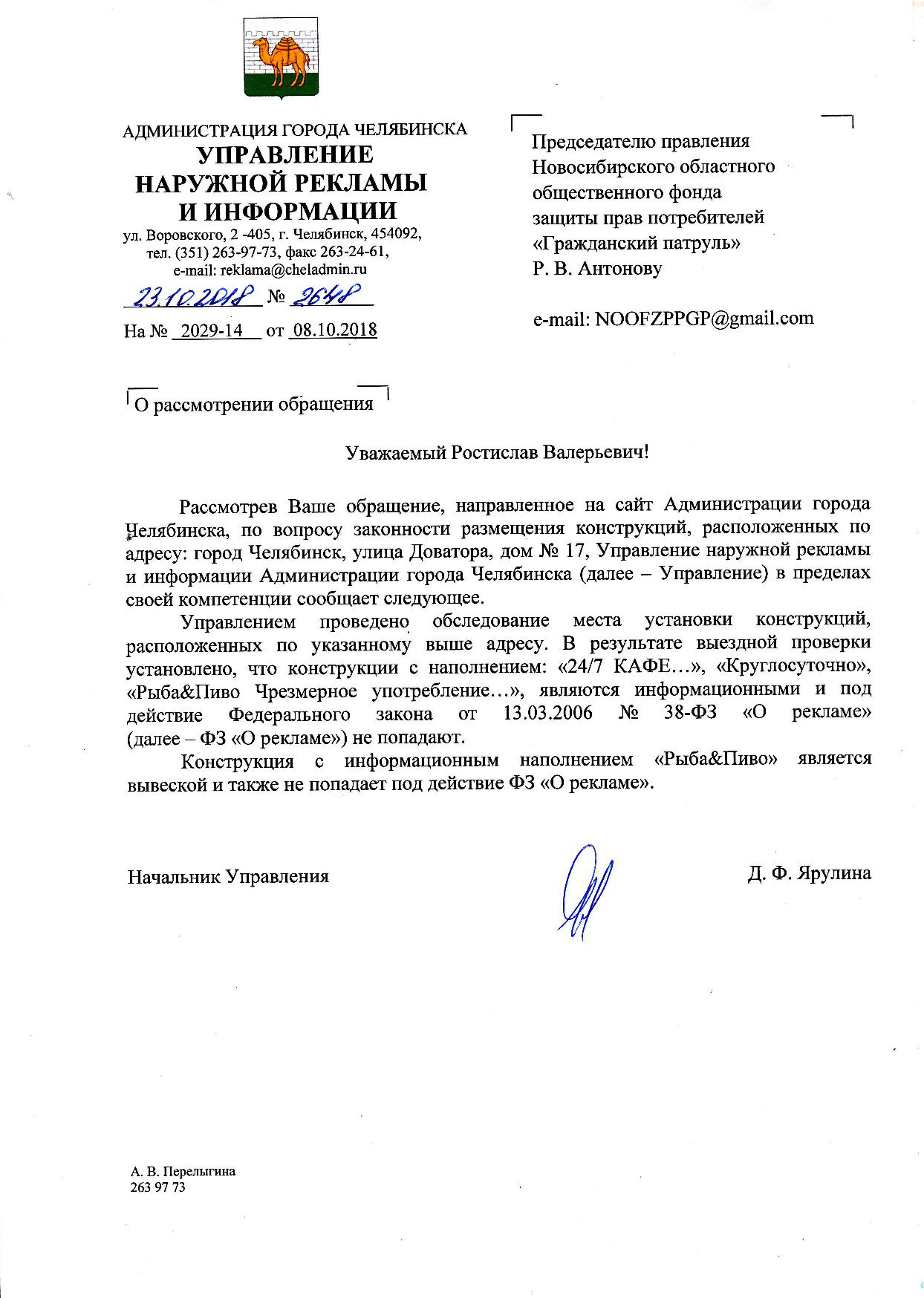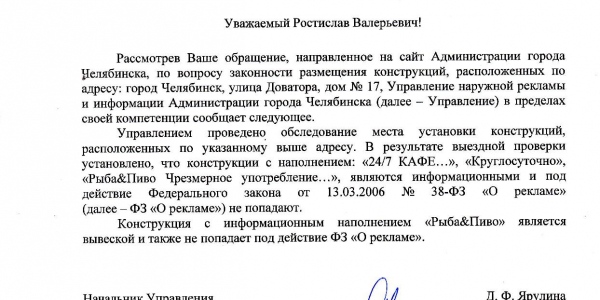 Номер жалобы:42304 Тип жалобы:Прочее Название объекта:Управление Наружной Рекламы И Информации Регион:Челябинская область Город:Челябинск Адрес:ул. Доватора, 17 Описание жалобы:Рекламная растяжка магазина Рыба и пиво, расположенного по адресу Доватора 17, закрывает окно и нарушает архитектурный облик здания. Статус: