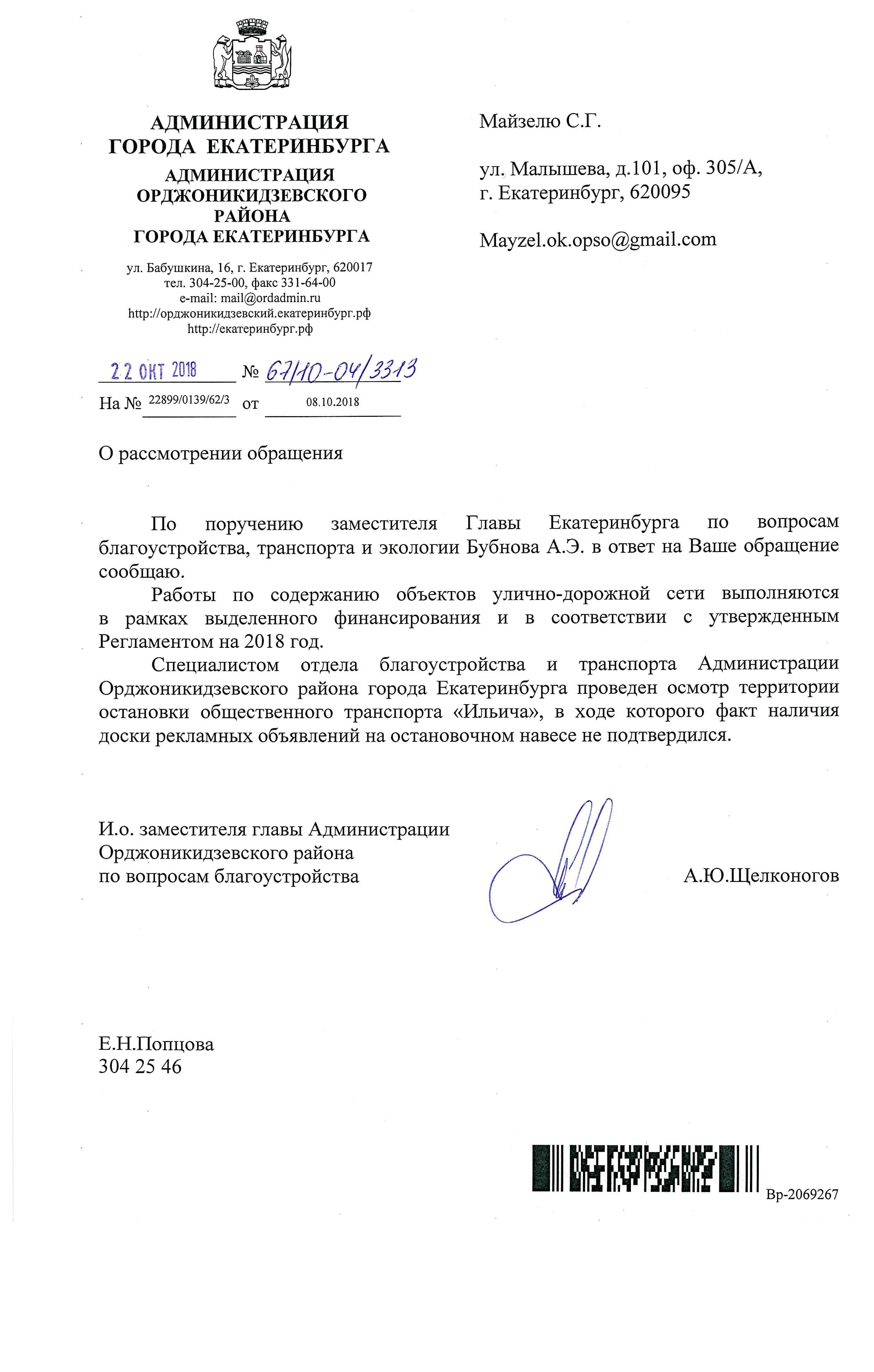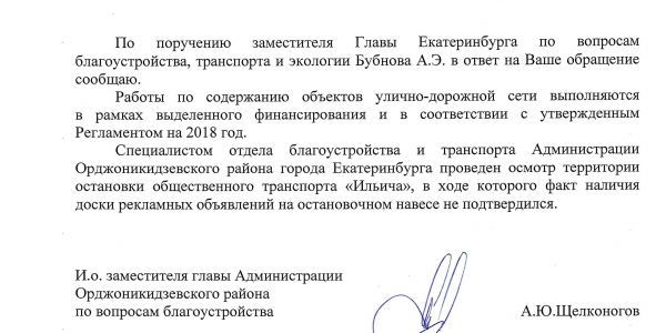 Номер жалобы:42336 Тип жалобы:Прочее Название объекта:Мэрия Регион:Свердловская область Город:Екатеринбург Адрес:улица Ильича Описание жалобы:На навесе на остановке «Ильича», расположенной на улице Ильича в направлении проспекта Космонавтов, размещена несогласованная доска рекламных объявлений. Статус: