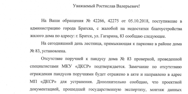Номер жалобы:42266 Тип жалобы:Прочее Название объекта:Программа Переселения Регион:Иркутская область Город:Братск Адрес:ул. Гагарина, 16 Описание жалобы:Лестница выхода с парковки не установлена, а просто валяется рядом. Гагарина, 83 Статус:
