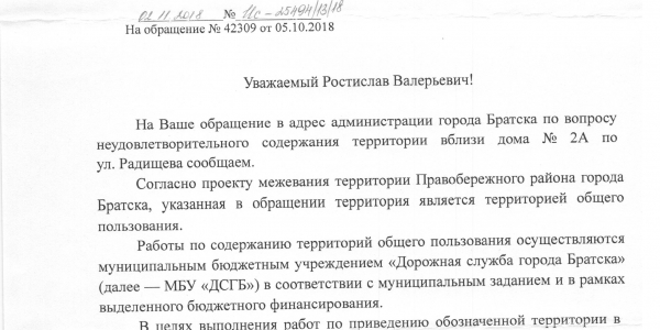 Номер жалобы:42309 Тип жалобы:Прочее Название объекта: Регион:Иркутская область Город:Братск Адрес:улица Радищева, 2А Описание жалобы:огромное количество мусора и битого стекла заросшего травой. территория не жкх. Статус: