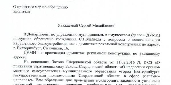 Номер жалобы:42329 Тип жалобы:Прочее Название объекта:МУГИСО Регион:Свердловская область Город:Екатеринбург Адрес:улица Смазчиков, 16 Описание жалобы:Оставлен фундамент демонтированной рекламной конструкции на перекрёстке улиц Смазчиков и Уральской со стороны дома 16 по улице Смазчиков, Статус: