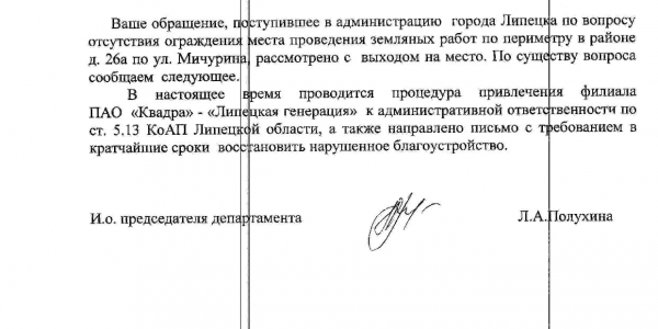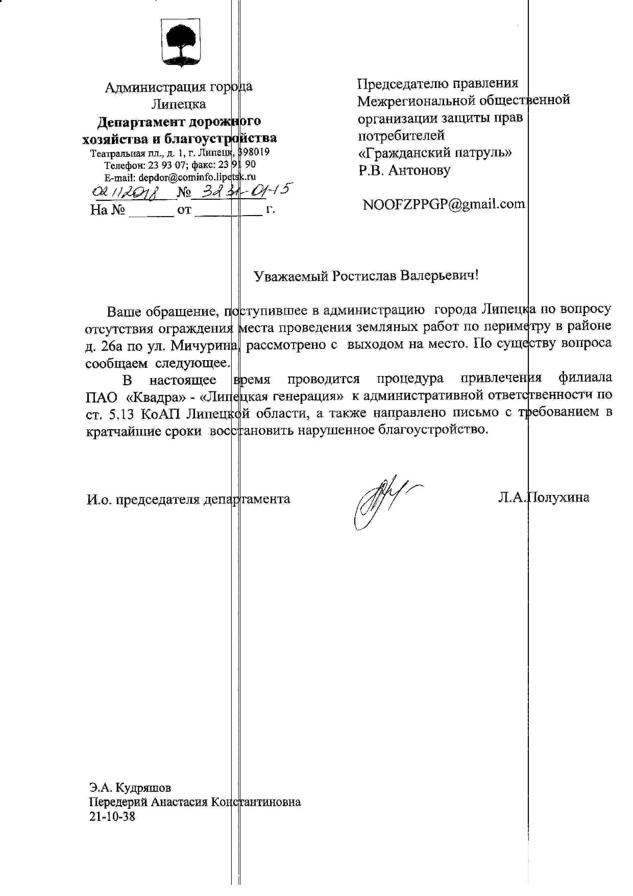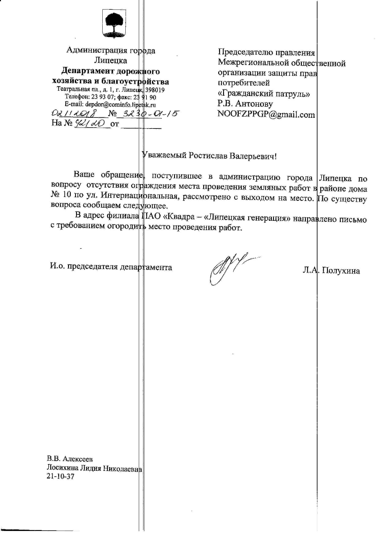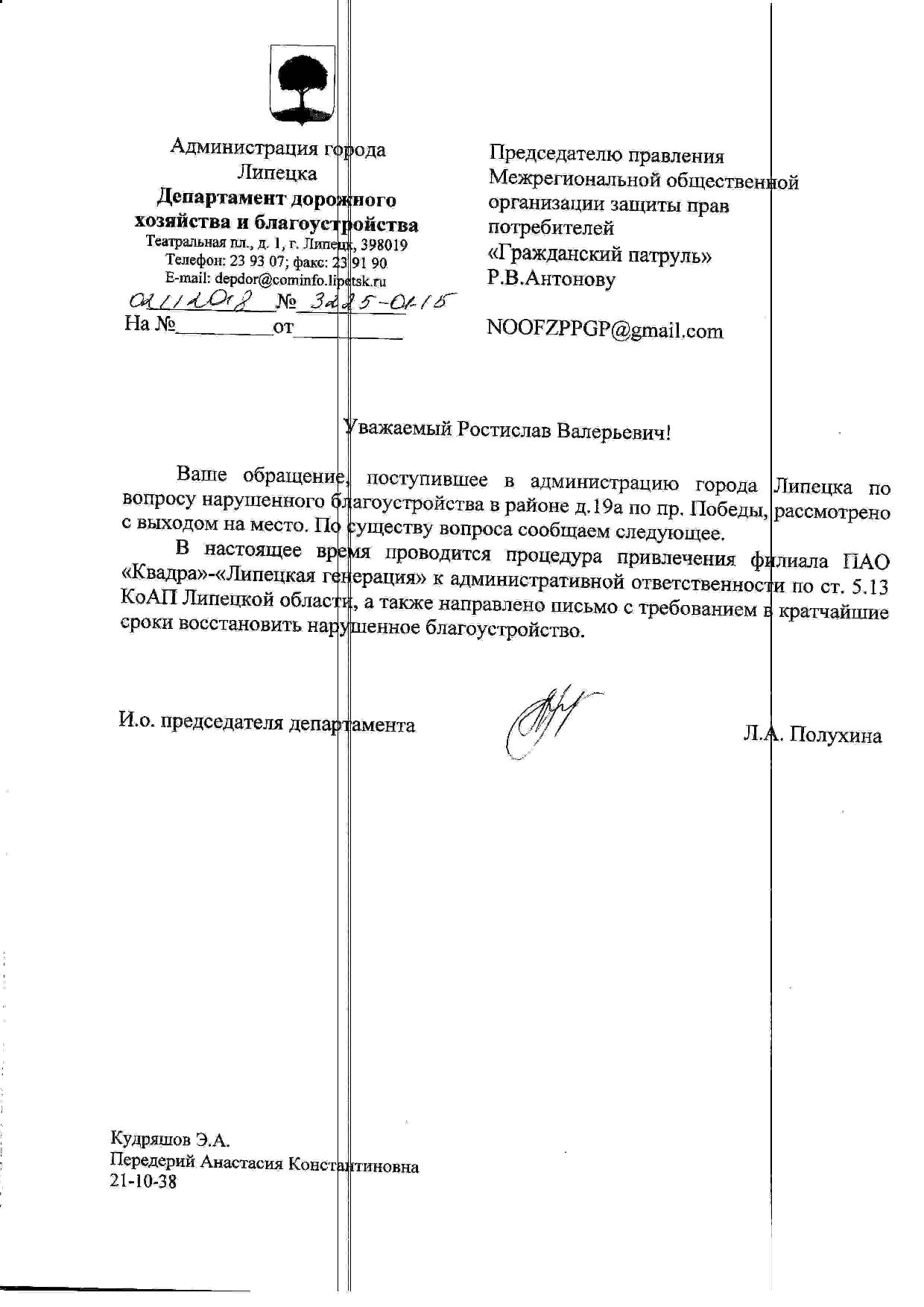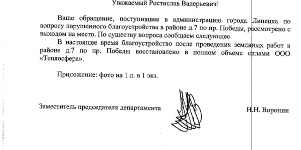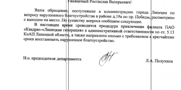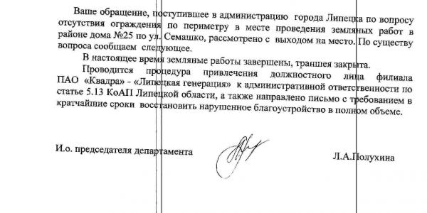 Номер жалобы:42152 Тип жалобы:Прочее Название объекта:Сети Регион:Липецкая область Город:Липецк Адрес:пр-т. Победы, 19А Описание жалобы:Нет благоустройства после работ Статус: