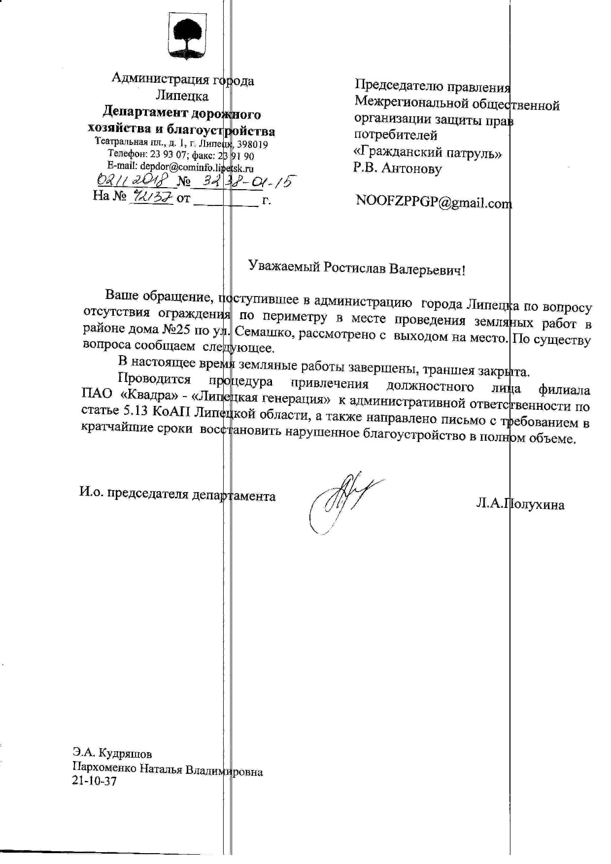 Номер жалобы:42137 Тип жалобы:Прочее Название объекта:М Регион:Липецкая Город:Липецк Адрес:ул. Семашко, 25 Описание жалобы:Не полное ограждение Статус: