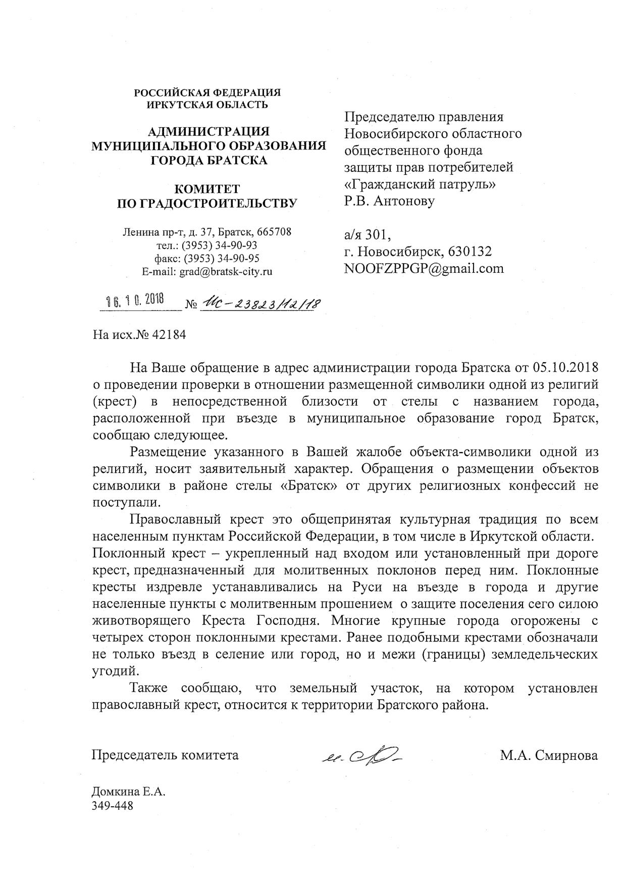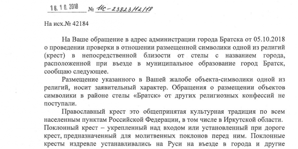 Номер жалобы:42184 Тип жалобы:Прочее Название объекта:Прокуратура Регион:Иркутская область Город:Братск Адрес:Р419, Описание жалобы:Размещение символики одной из религий в непосредственной близости от стеллы с названием города. Таким образом, заявляется ассоциация города с одной конфессией, не смотря на многоконфессиональность страны Статус: