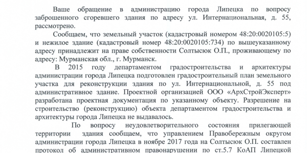 Номер жалобы:42111 Тип жалобы:Прочее Название объекта:Мэрия Регион:Липецкая область Город:Липецк Адрес:ул. Интернациональная, 55 Описание жалобы:Сгоревший дом не огражден Статус: