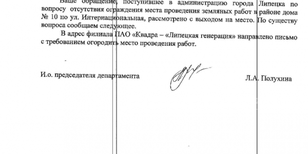 Номер жалобы:42120 Тип жалобы:Прочее Название объекта:Мэрия Регион:Липецкая область Город:Липецк Адрес:ул. Интернациональная, 10 Описание жалобы:Нет ограждения Статус: