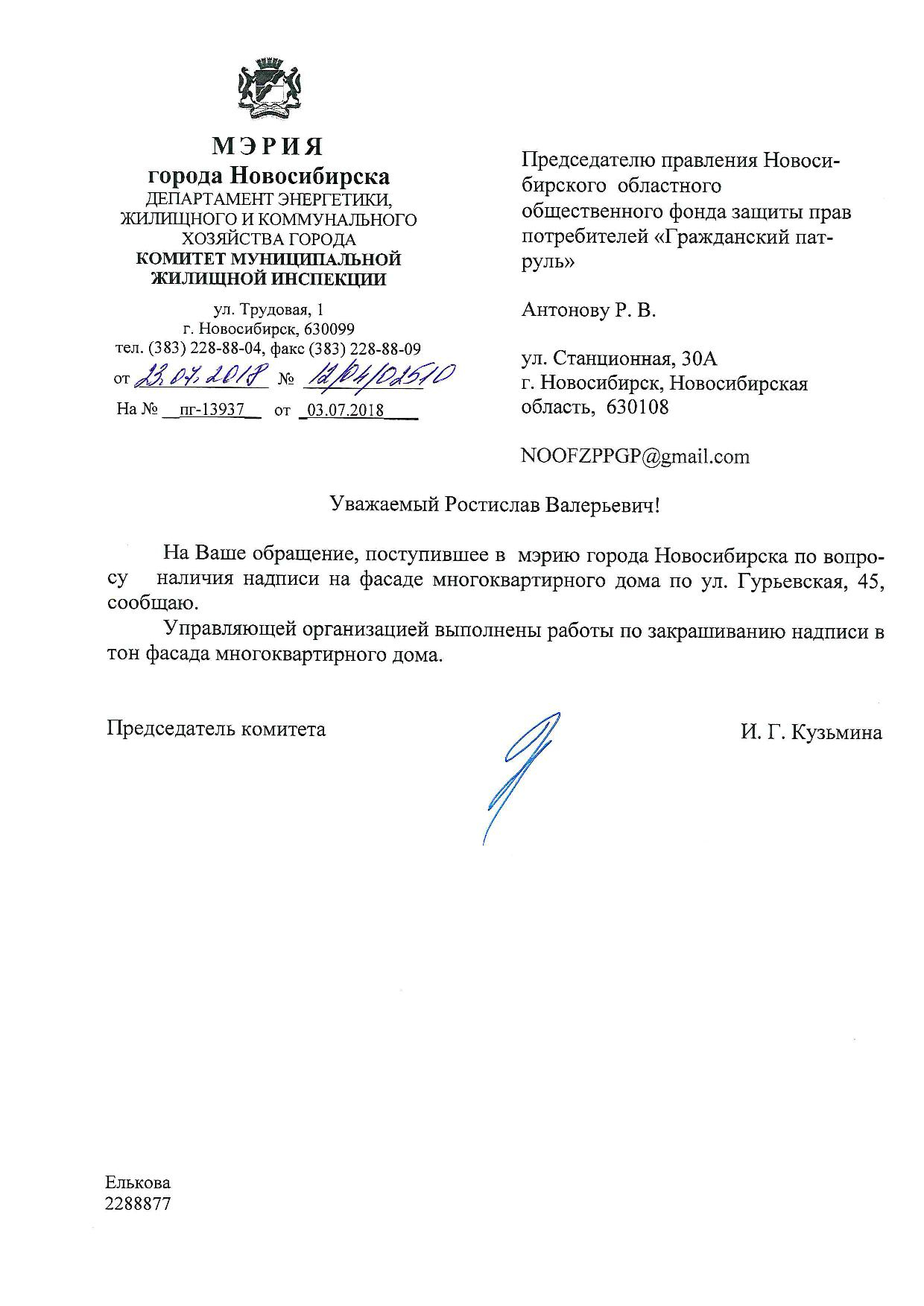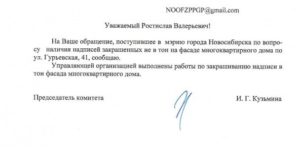 Номер жалобы:37696 Тип жалобы:Иные проблемы ЖКХ Название объекта:Управляющая Компания Регион:Новосибирская область Город:Новосибирск Адрес:ул. Гурьевская, 47 Описание жалобы:Надписи закрашены не в тон Статус:
