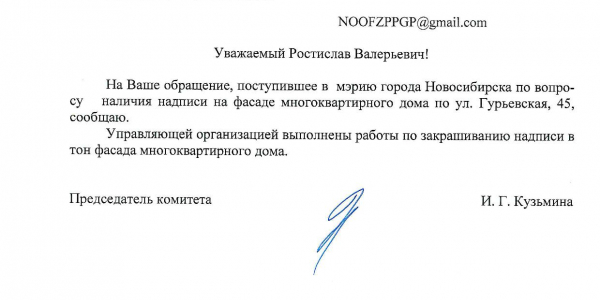 Номер жалобы:37692 Тип жалобы:Иные проблемы ЖКХ Название объекта:Управляющая Компания Регион:Новосибирская область Город:Новосибирск Адрес:ул. Гурьевская, 43 Описание жалобы:Надписи на фасаде дома закрашеныне в тон Статус: