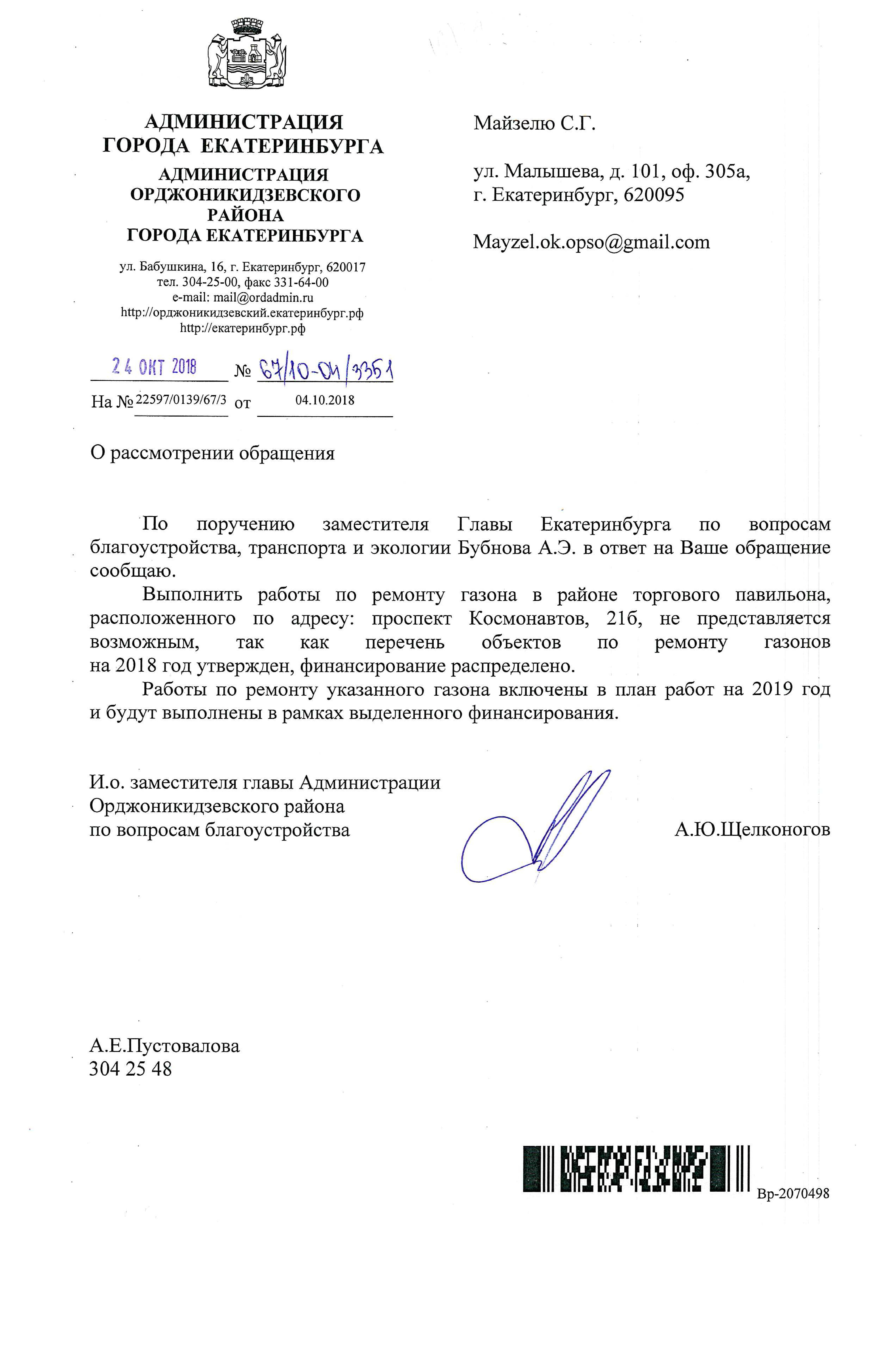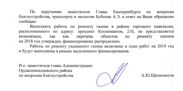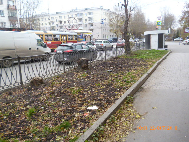 Номер жалобы:42068 Тип жалобы:Прочее Название объекта:Мэрия Регион:Свердловская область Город:Екатеринбург Адрес:проспект Космонавтов Описание жалобы:Яма на газоне у остановки «Метро Уралмаш» в направлении центра. Статус: