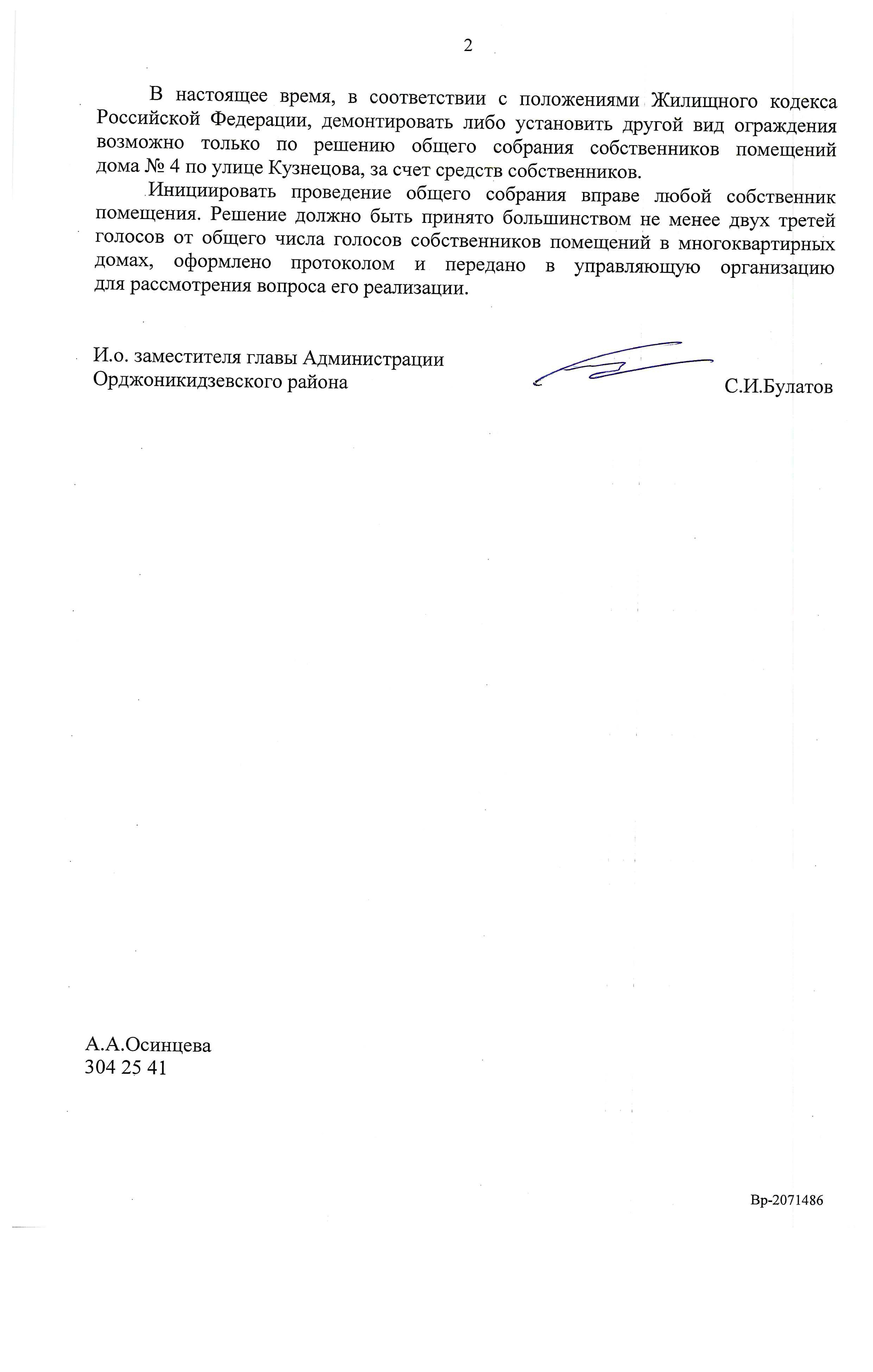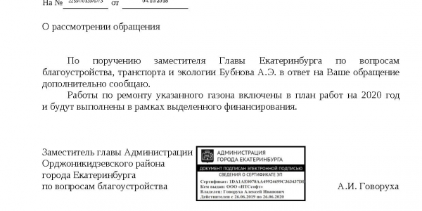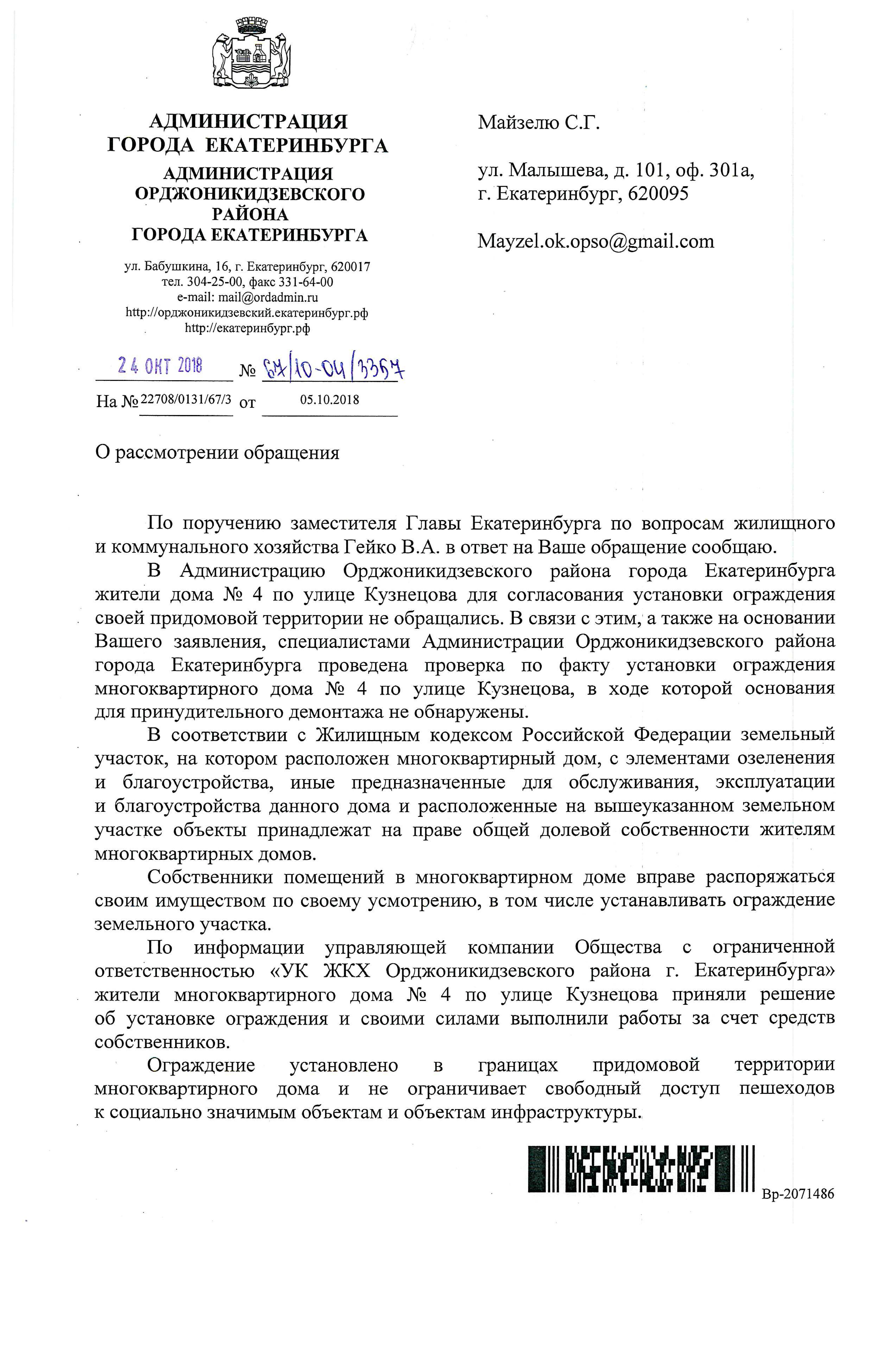 Номер жалобы:42064 Тип жалобы:Прочее Название объекта:Мэрия Регион:Свердловская область Город:Екатеринбург Адрес:улица Кузнецова, 4 Описание жалобы:В 2018 году на территории многоквартирного жилого дома 4 по улице Кузнецова были выполнены работы по установке ограждения. Согласно п. 143 Правил благоустройства территории муниципального образования «город Екатеринбург», многоквартирные жилые дома среднеэтажной и многоэтажной застройки, не образующей замкнутый периметр, при наличии внутри квартала объектов общественного назначения и транзитных пешеходных путей могут быть огорожены прозрачными ограждениями высотой не более 0,9 м. Однако высота устанавленных ограждений составляет 1,6 м. Статус:
