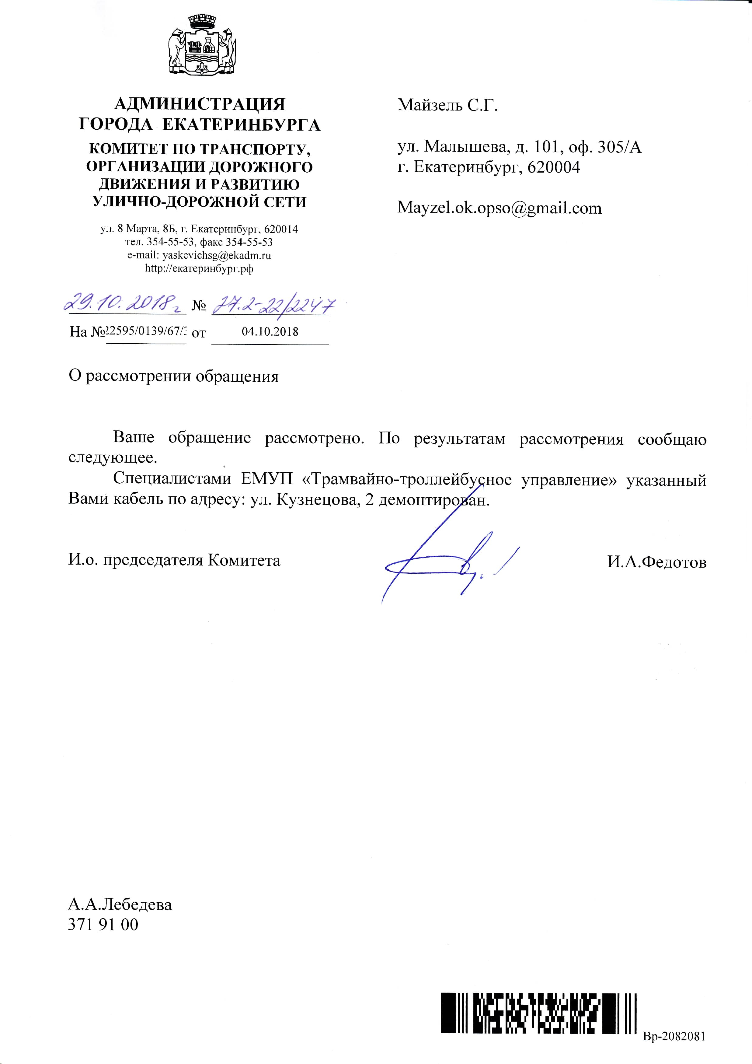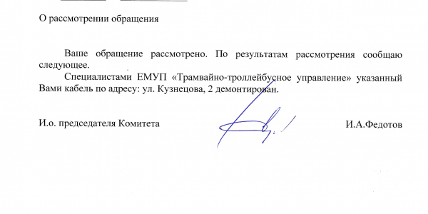 Номер жалобы:42066 Тип жалобы:Прочее Название объекта:Мэрия Регион:Свердловская область Город:Екатеринбург Адрес:Кузнецова, 2 Описание жалобы:С опоры освещения, на которой расположены знак «место остановки автобуса» и расписание движения автобусов для остановки «Метро Уралмаш» в направлении площади 1-й Пятилетки, свисает обрезок кабеля с оголённым концом. Статус: