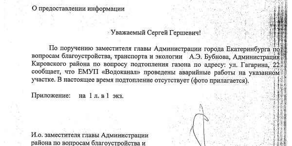 Номер жалобы:42062 Тип жалобы:Прочее Название объекта:МУП Водоканал Регион:Свердловская область Город:Екатеринбург Адрес:улица Гагарина, 22 Описание жалобы:Протечка водовода, в результате которой регулярно затапливает газон. В августе произведён ремонт водопровода, но это не решило проблему. Статус: