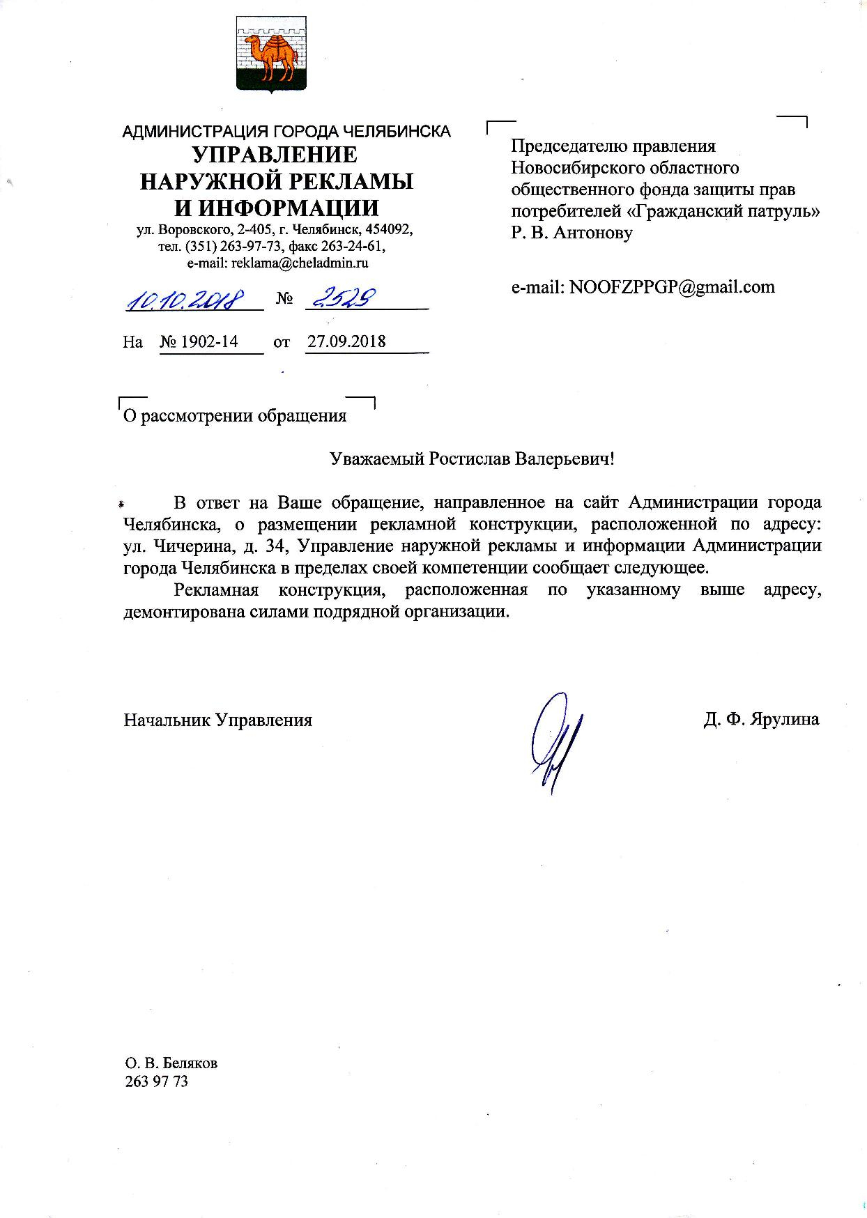 Номер жалобы:41963 Тип жалобы:Прочее Название объекта:Администрация Регион:Челябинская область Город:Челябинск Адрес:ул. Чичерина, 34 Описание жалобы:На газоне между Чичерина, 36 и Чичерина, 34 повторно появилась рекламная консультация