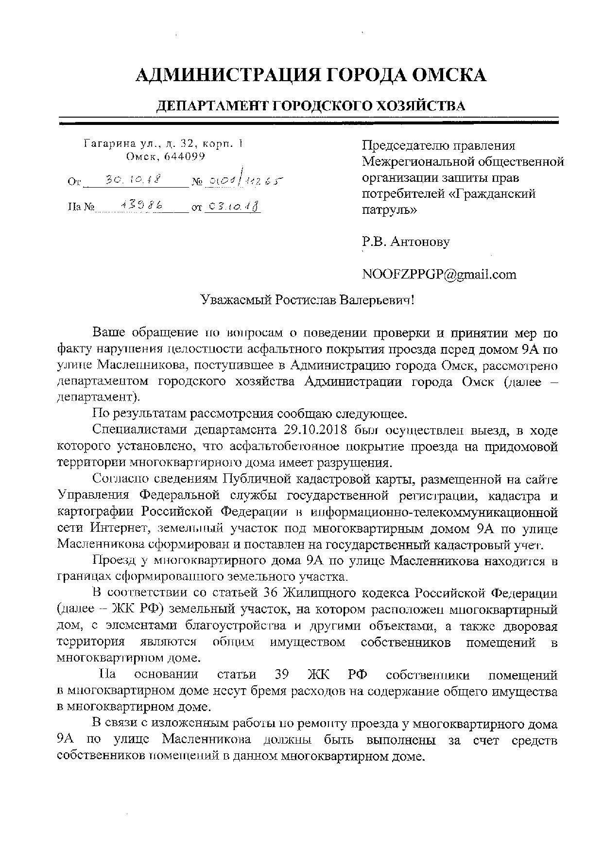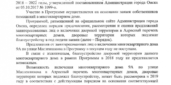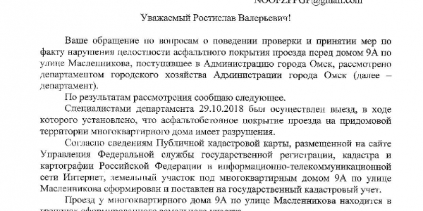Номер жалобы:41993 Тип жалобы:Прочее Название объекта:? Регион:Омская область Город:Омск Адрес:ул. Масленникова, 9а Описание жалобы:Ямы во дворе на всем протяжении проезда перед домом 9а. После дождя здесь множество луж и грязь. в здании именно по этому проезду находятся врачебно-физкультурный диспансер и центр здоровья. хорошая физкультура у диспансера на въезде Статус: