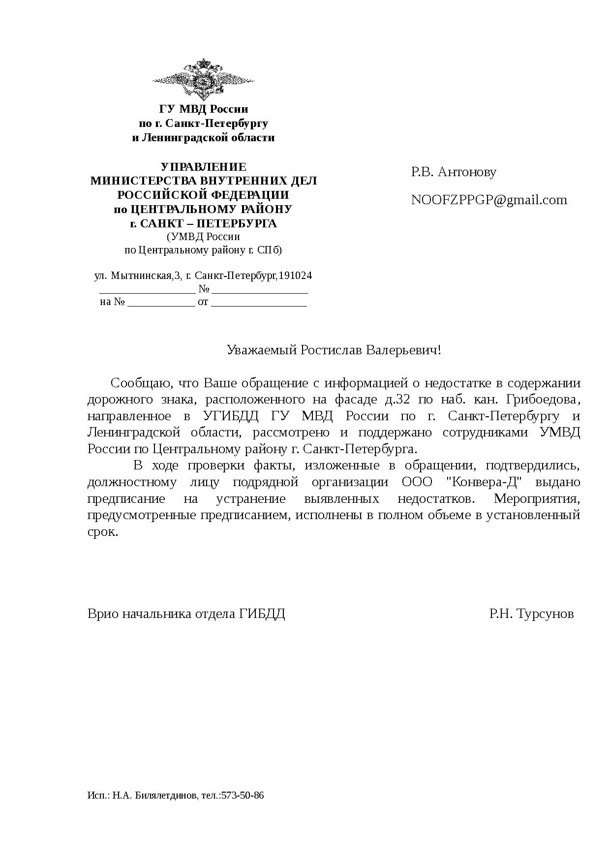 Номер жалобы:42041 Тип жалобы:Прочее Название объекта:Администрация Района Город:Санкт-Петербург Адрес:Санкт-Петербург, 32 набережная канала Грибоедова Описание жалобы:Сорван знак Статус: